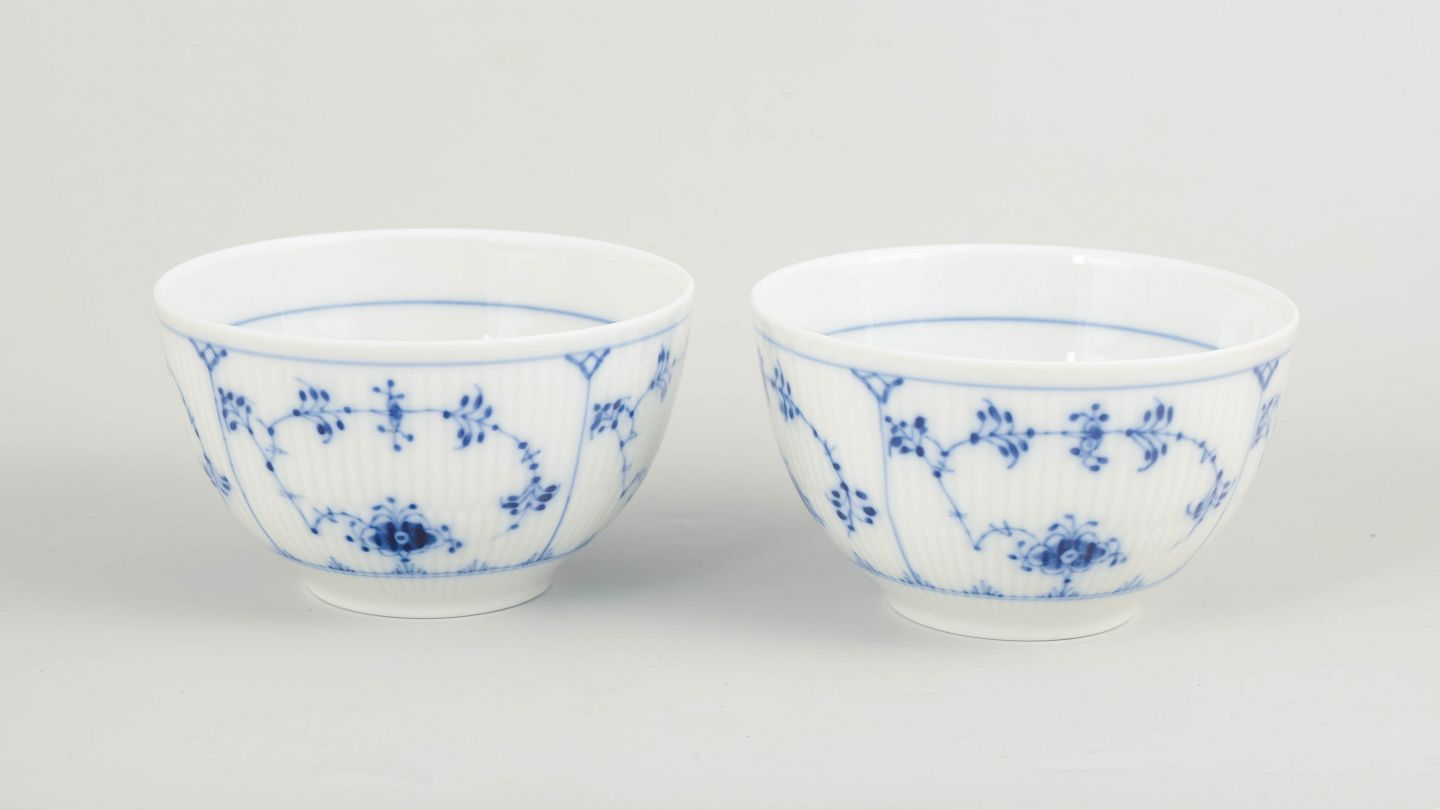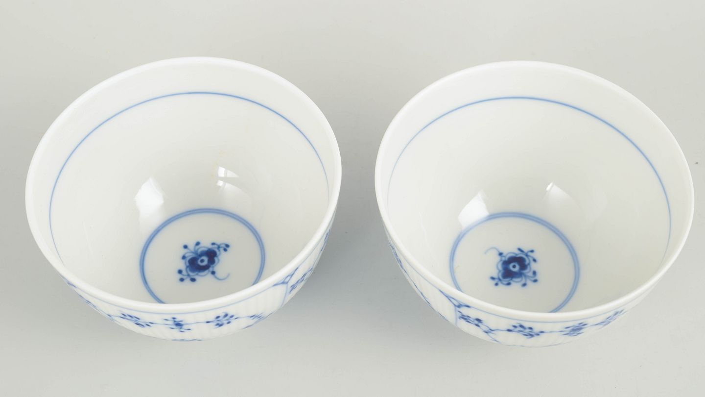 Sæt af to skåle i håndmalet porcelæn fra Musselmalet Riflet med klassisk underglasurdekoration i koboltblå og riflede felter. Model 1/209. H. 7 cm, D. 12 cm. Første sortering. Fremstillet i 1980’erne.