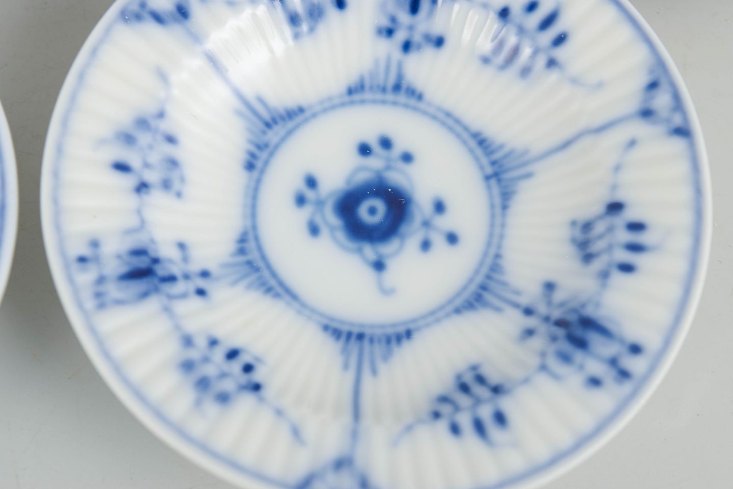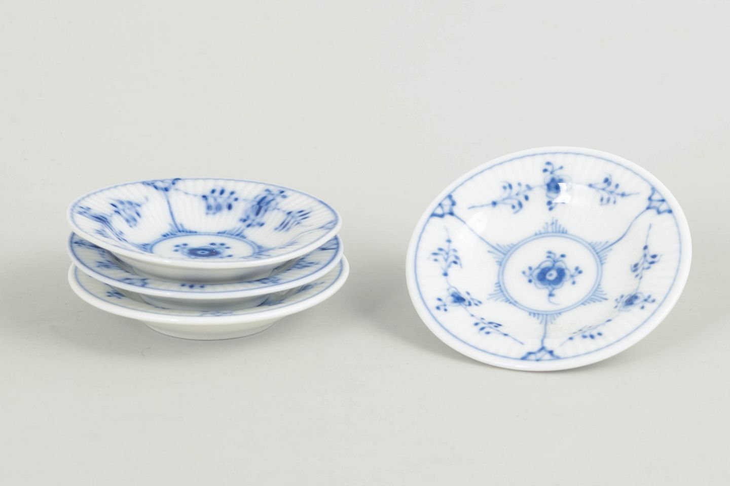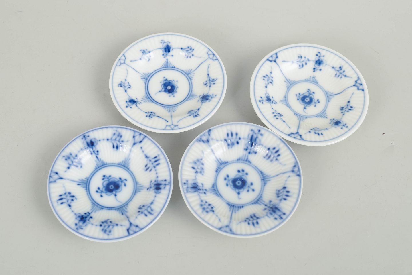 Sæt af fire små kaviarskåle i håndmalet porcelæn fra Musselmalet Riflet med klassisk underglasurdekoration i koboltblå og riflede felter. Model 1/7. Første sortering.