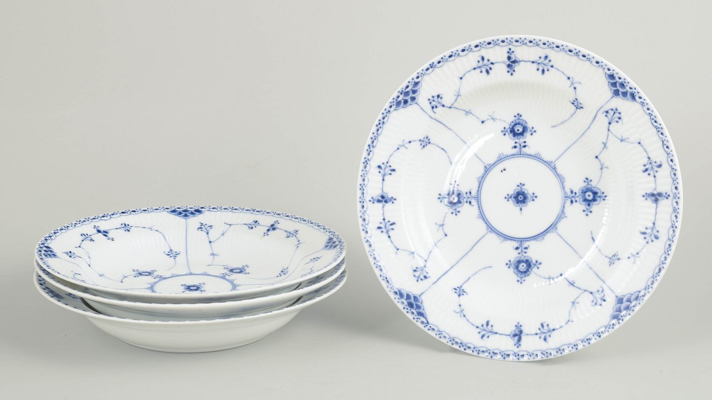 Sæt af fire dybe tallerkener i håndmalet porcelæn fra Musselmalet Halvblonde med klassisk underglasurdekoration i koboltblå og karakteristisk blondekant. Model 1/565. Første sortering.