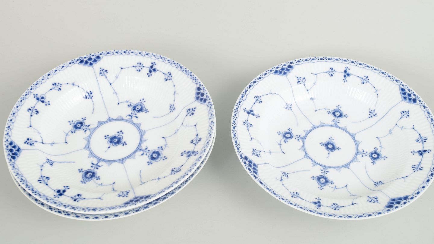 Text zugänglich auf Dänische: Royal Copenhagen Musselmalet Halvblonde sæt af fire dybe tallerkener.