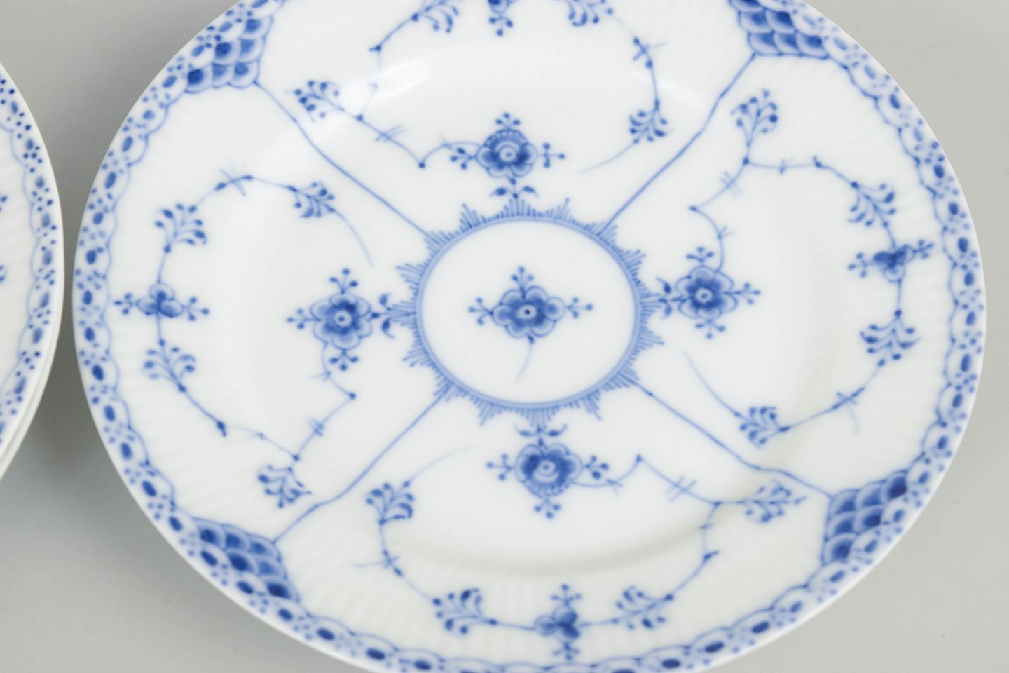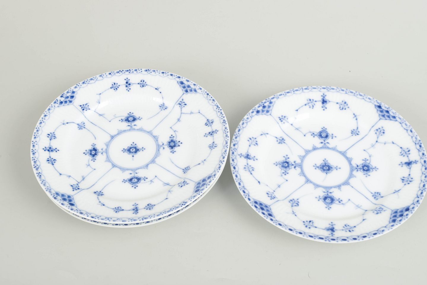 Sæt af tre tallerkener i håndmalet porcelæn fra Musselmalet Halvblonde med klassisk underglasurdekoration i koboltblå og karakteristisk blondekant. Model 1/573. Første sortering.