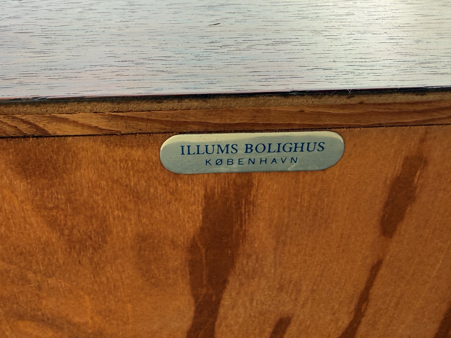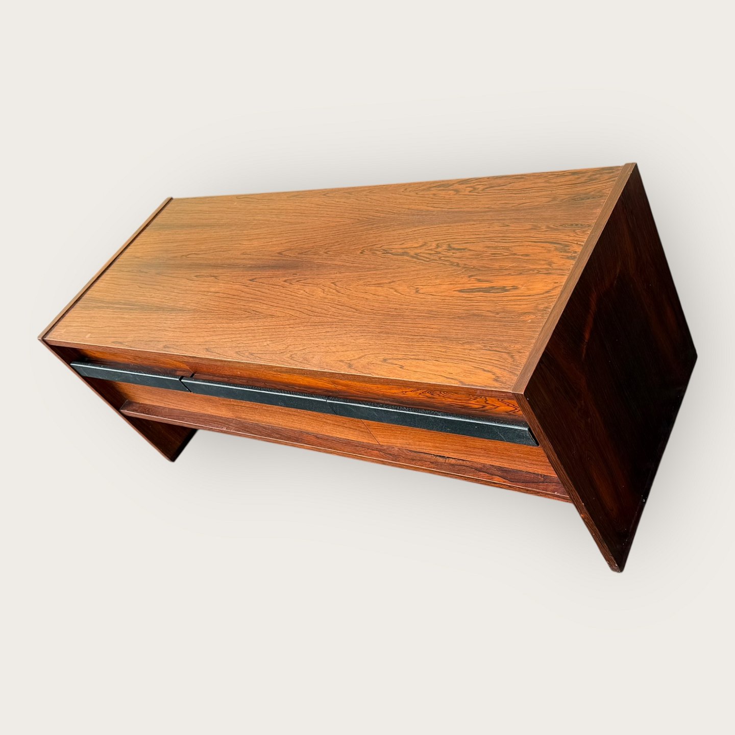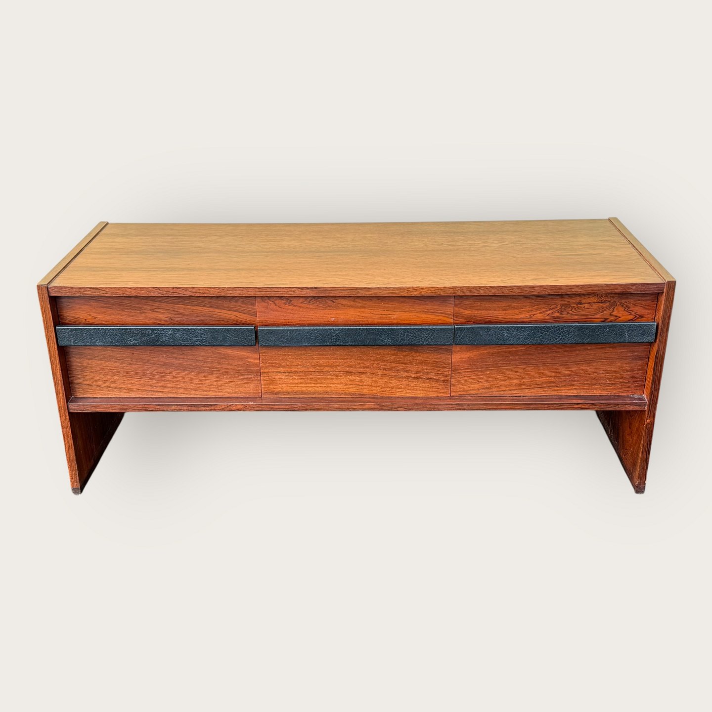 | Niedriges Sideboard aus Palisanderfurnier, drei Schubladen mit lederbezogenen Griffen, nicht mehr im Sortiment von Illums Bolighus, Maße: H x B x T 46 x 116 x 45 cm, bildete zusammen mit dem Palisanderspiegel (Artikelnummer 632831) ein großes Flur-Ensemble. *In gutem, gebrauchtem Zustand mit wenigen Gebrauchsspuren.*
