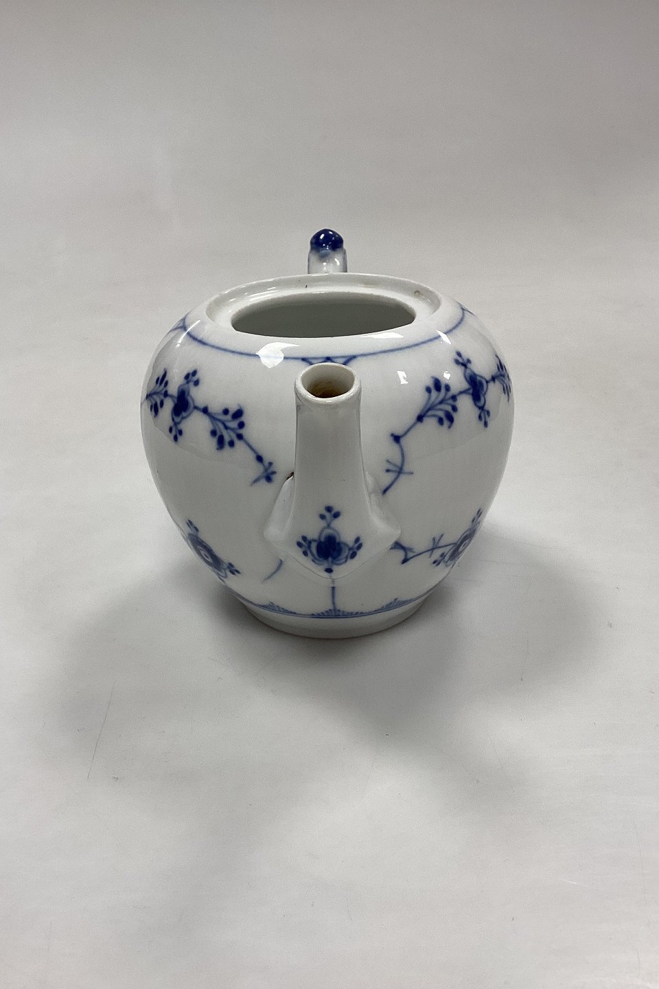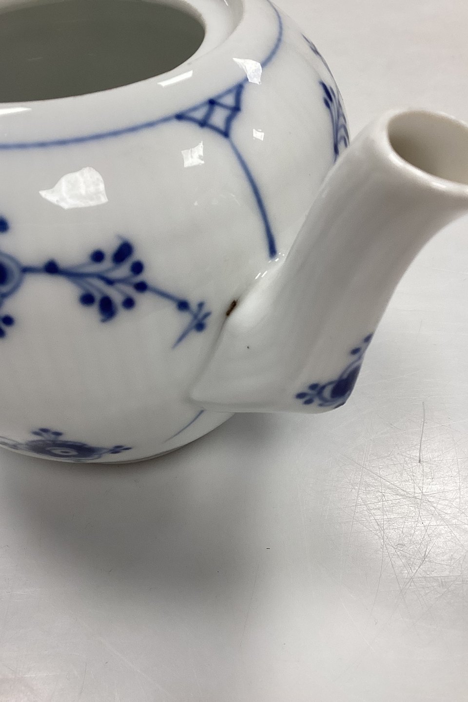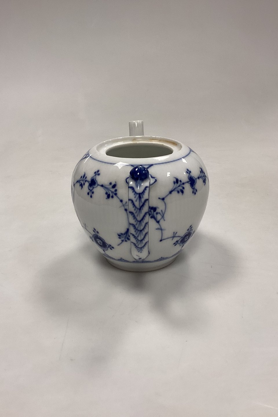 Royal Copenhagen Musselmalet Riflet Tekande, lille No. 258 uden låg. Måler 19,5 cm / 7,67 in. fra tud til hank. Højde 11 cm / 4,33 in. 2. Sortering med små brændingsfejl, se fotos.