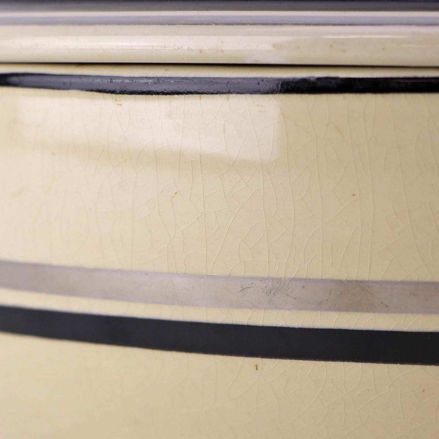 Råhvidt fajancestel i stelform E med dekoration af naturmotiver i sølv og sort farve.