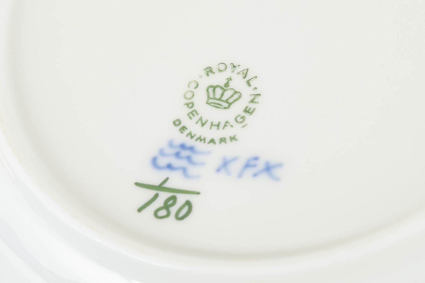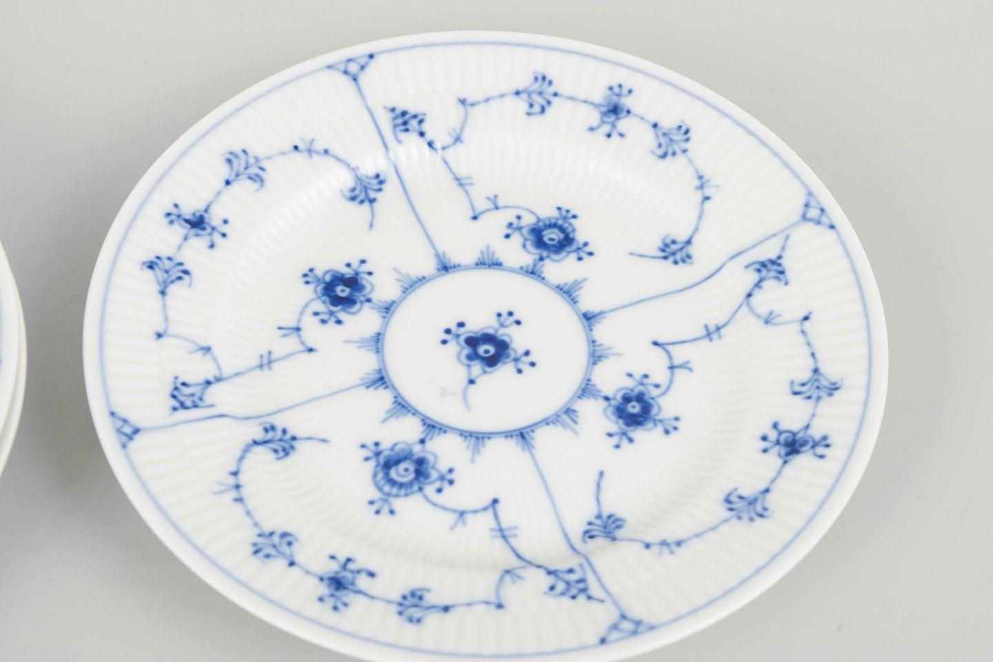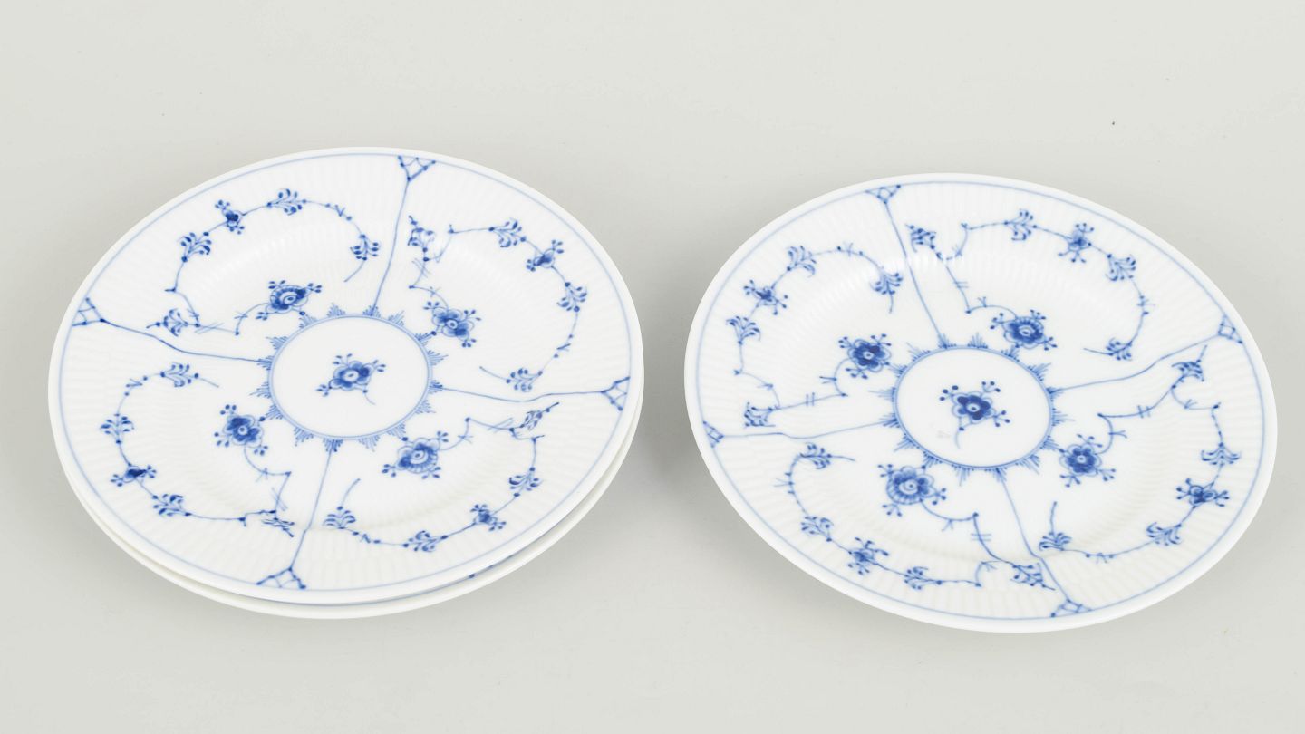 Text zugänglich auf Dänische: Royal Copenhagen Musselmalet Riflet, sæt af tre kagetallerkener.