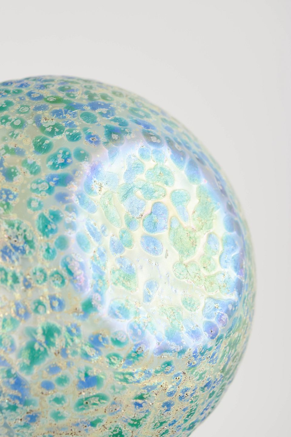 Kugleformet vase i mundblæst glas med let indsnævret åbning og afrundet korpus. Overfladen har kraftig iriserende dekoration i blå, grønne og gyldne nuancer med tæt, organisk struktur, der giver et levende og næsten mosaiklignende farvespil. Den kompakte form kombineret med den rige overfladevirkning er karakteristisk for Loetz’ produktion i 1920’erne, hvor eksperimenterende dekorationsteknikker fortsatte efter art nouveau-perioden.