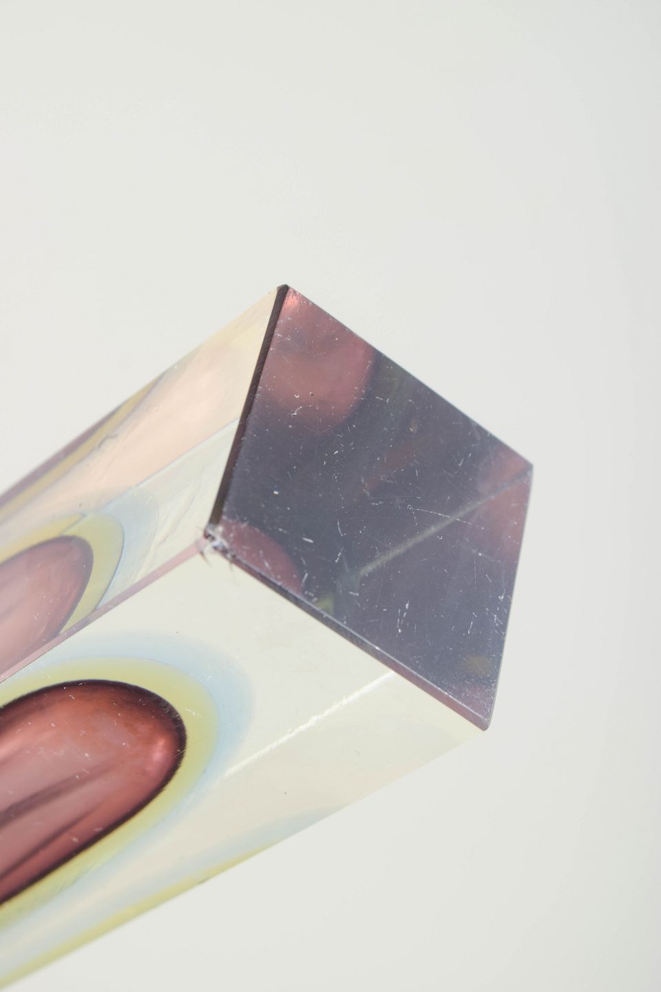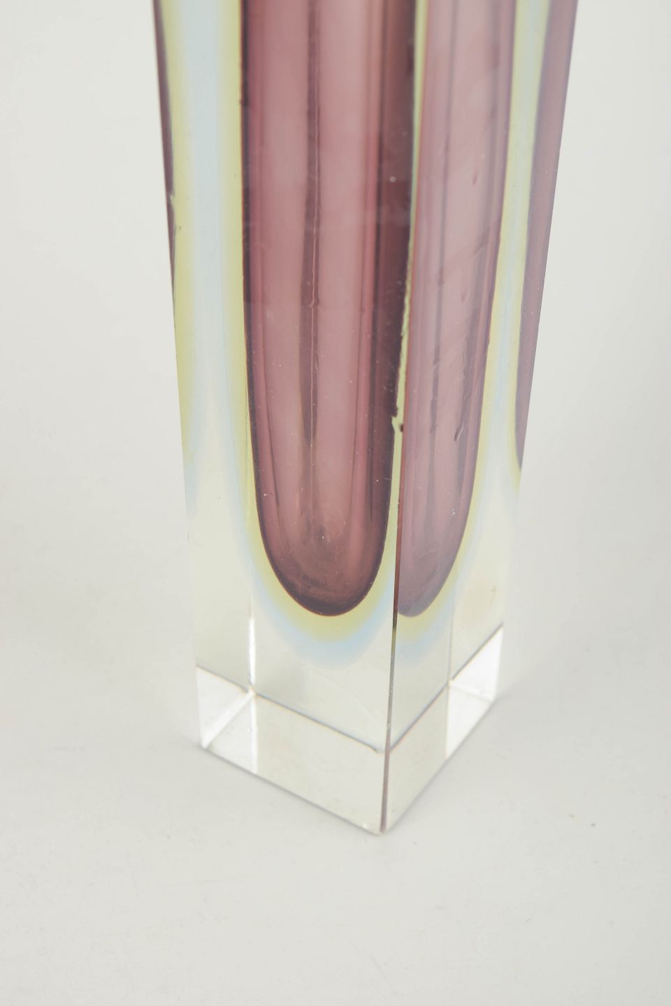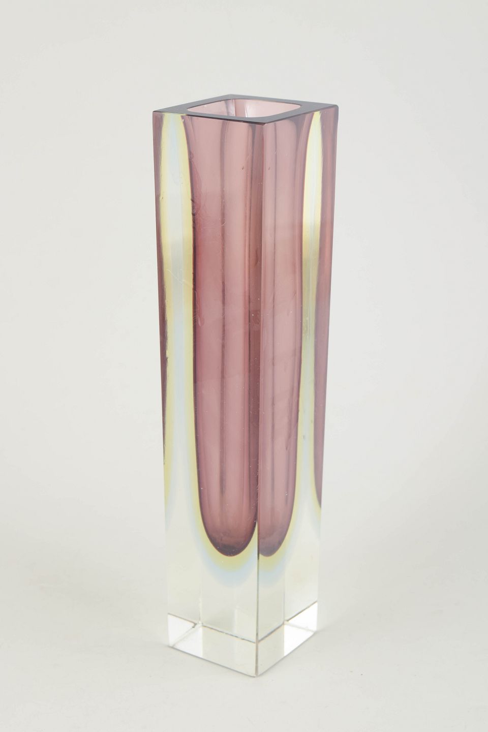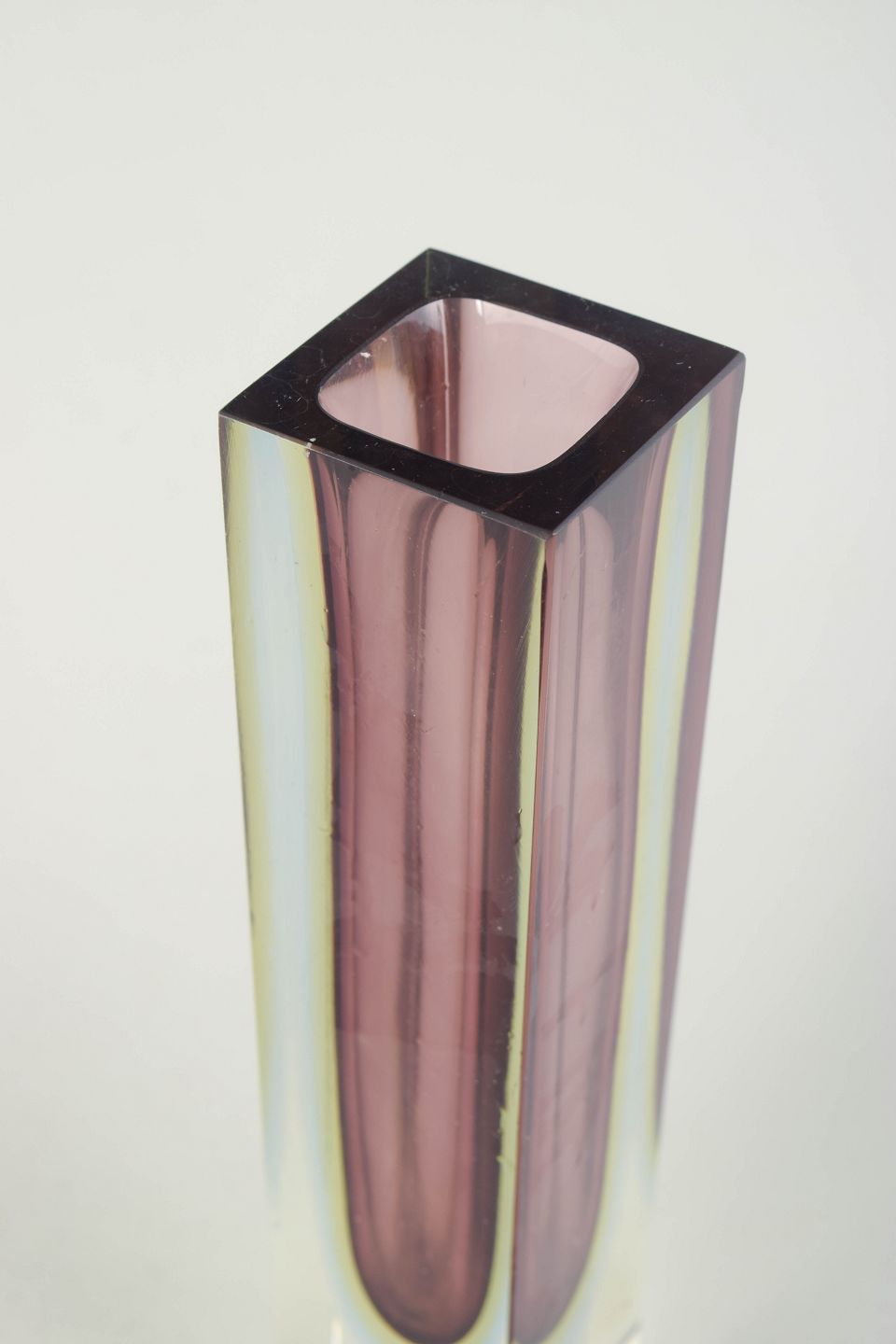 Høj, rektangulær vase i klart og rosafarvet glas med indkapslet farvekerne og facetslebne sider.