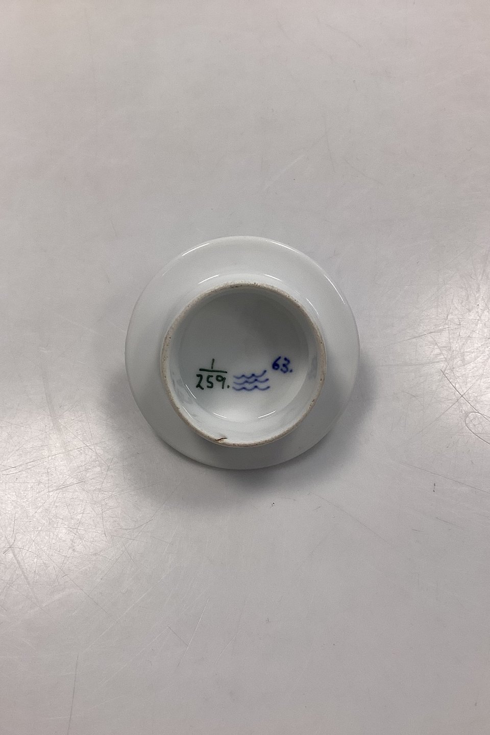 Royal Copenhagen Musselmalet Riflet Låg til Tekande No. 259. Indre diameter måler 5,4 cm / 2,12 in. 1. Sortering med brændingsrevne inderst, se foto.