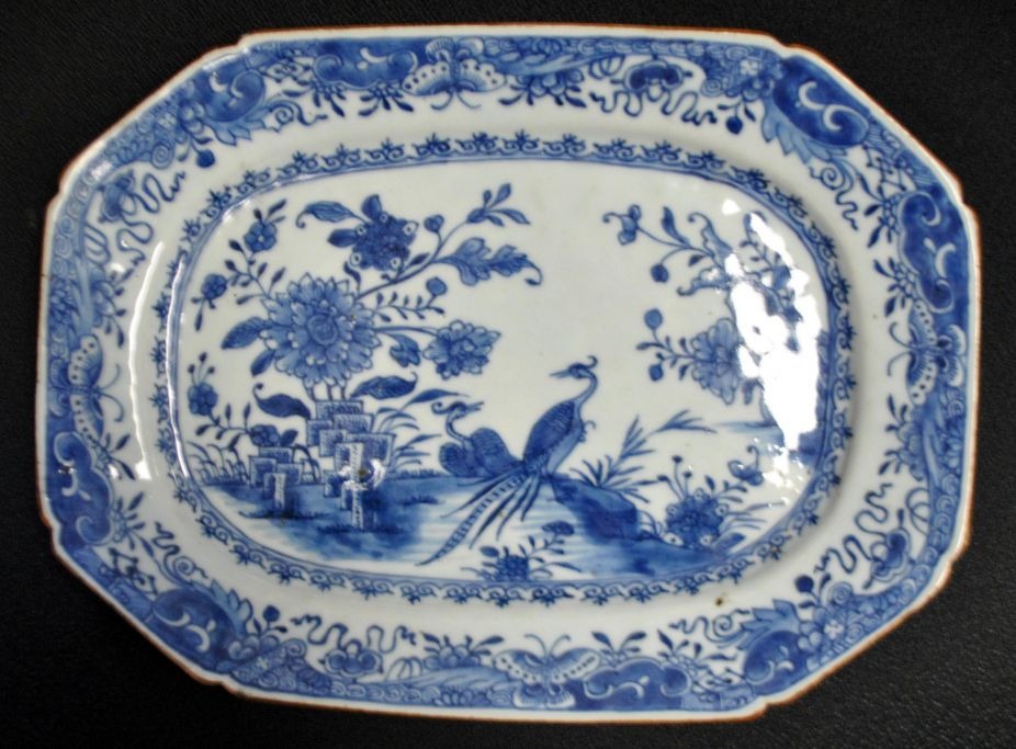 Chinesische, blau dekorierte, achteckige Schale, ca. 1780. Kangxi-Dynastie. Verziert mit Landschafts-, Vogel- und Blumenmotiven. Unmarkiert. L.: 31,5 cm. B.: 23 cm.