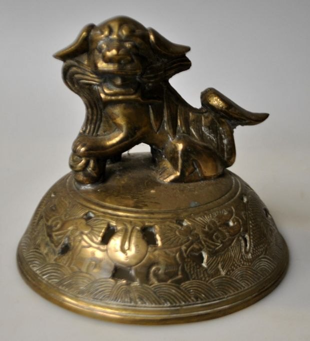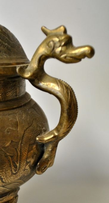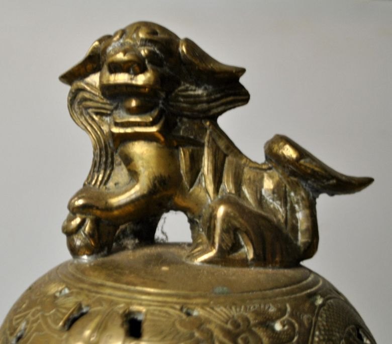 Dreibeiniger chinesischer Räuchergefäß aus Bronze, 19. Jahrhundert. Mit zwei Henkeln; durchbrochener Deckel mit Löwenmotiv. Der Korpus ist mit einem Drachen und Blumen verziert. Höhe: 32 cm, Breite: 25 cm. Gestempelt.