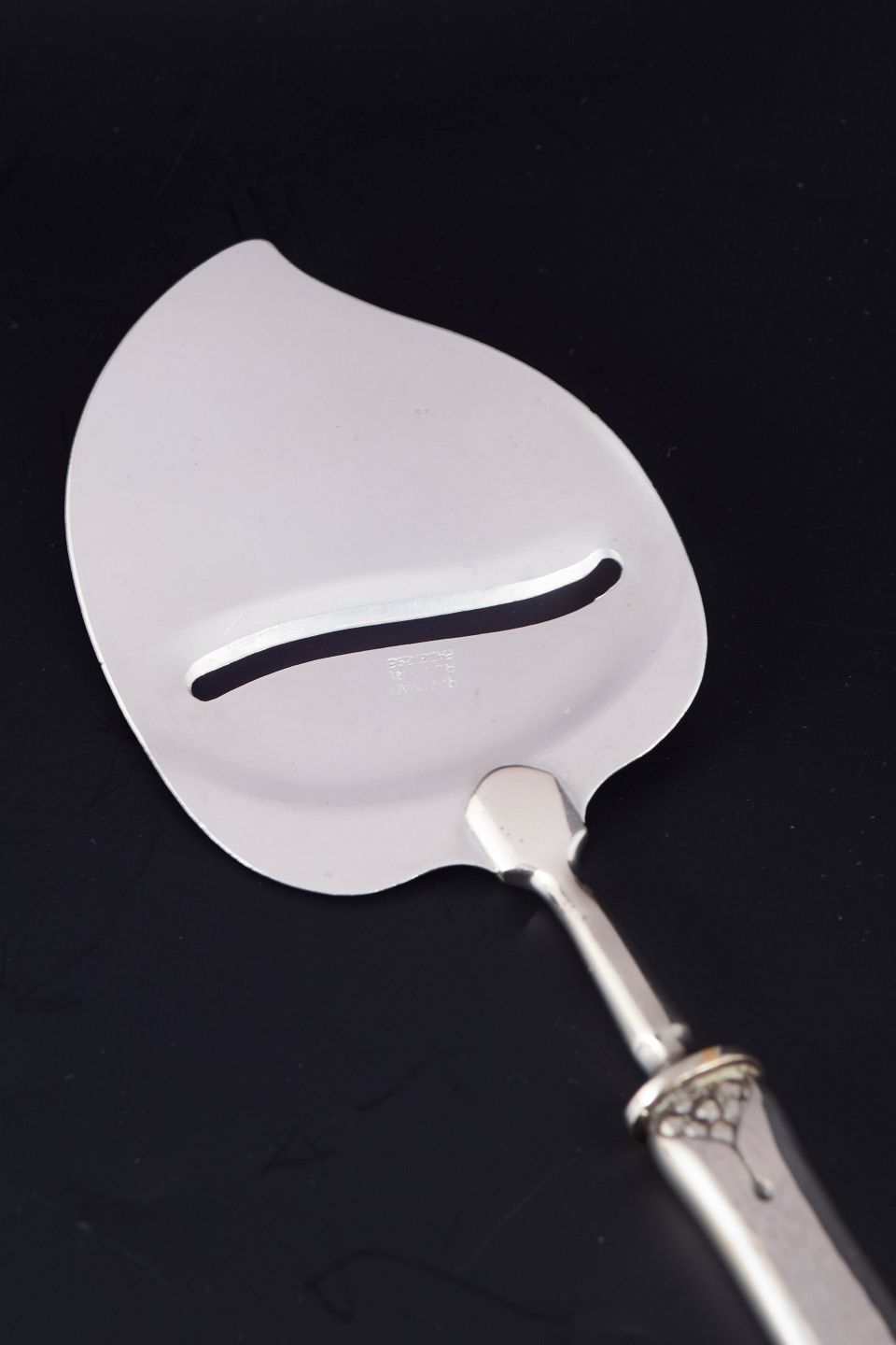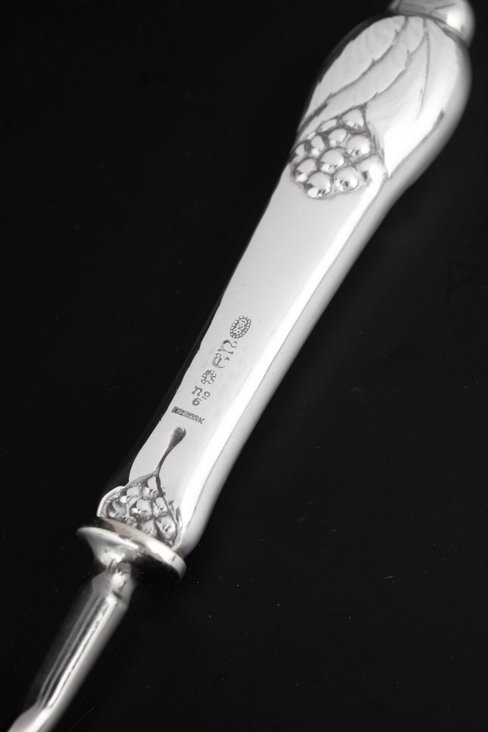 Art deco ostehøvl i tretårnet sølv og rustfrit stål. Model nummer 6 med dekorativt skaft i relief med stiliseret blomstermotiv. Fremstillet hos Evald Nielsen.