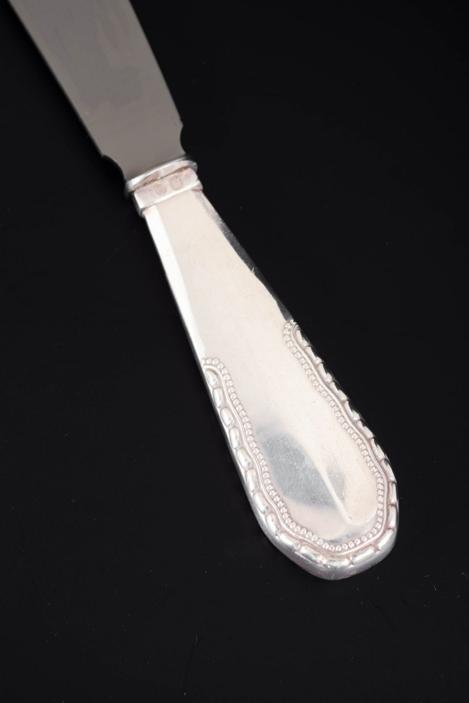 Sjælden lagkagekniv, blad i rustfrit stål, skaft i tretårnet sølv i mønstret Nordisk. Kniven har et karakteristisk bredt blad med lille udskæring ved spidsen og et elegant sølvskaft med bløde former og dekorativ rand, typisk for Georg Jensens klassiske bestikdesign fra begyndelsen af det 20. århundrede. Mærket med tretårnet sølvstempel.