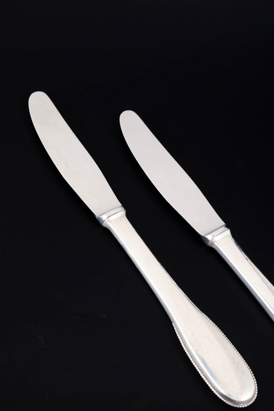 Elegante middagsknive i sterlingsølv og rustfrit stål. Model nummer 14 med klassisk, let afrundet skaftform med diskret perlekant og glat klinge. Fremstillet hos Evald Nielsen.