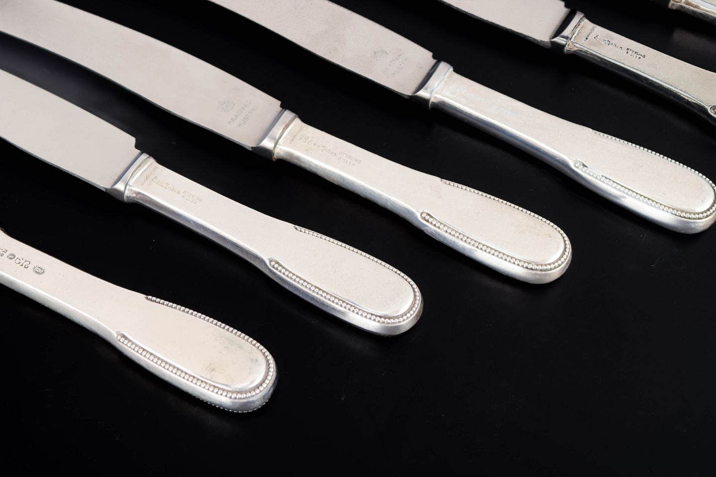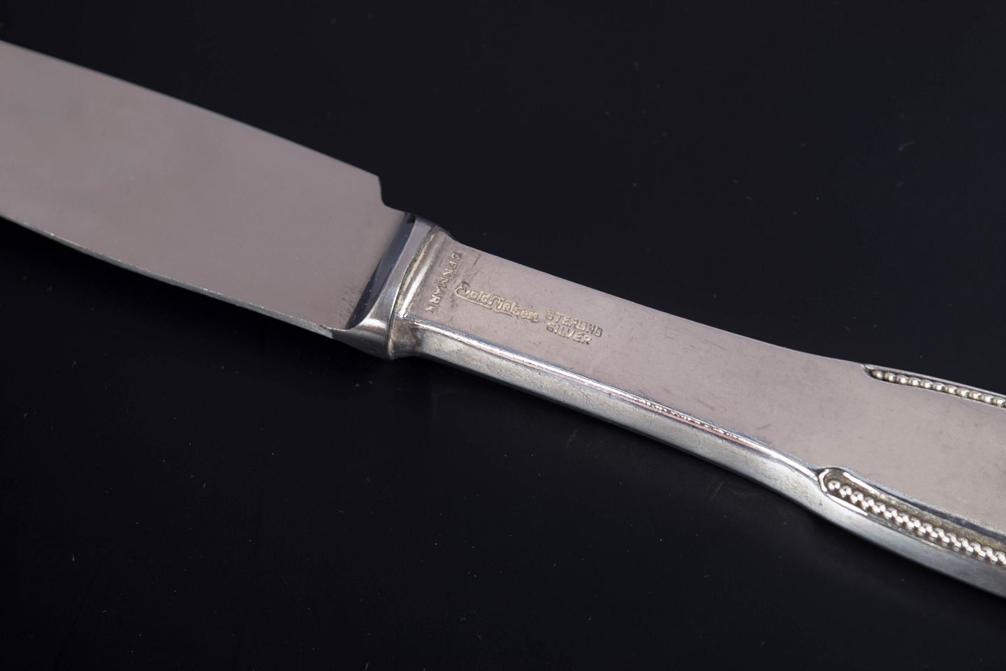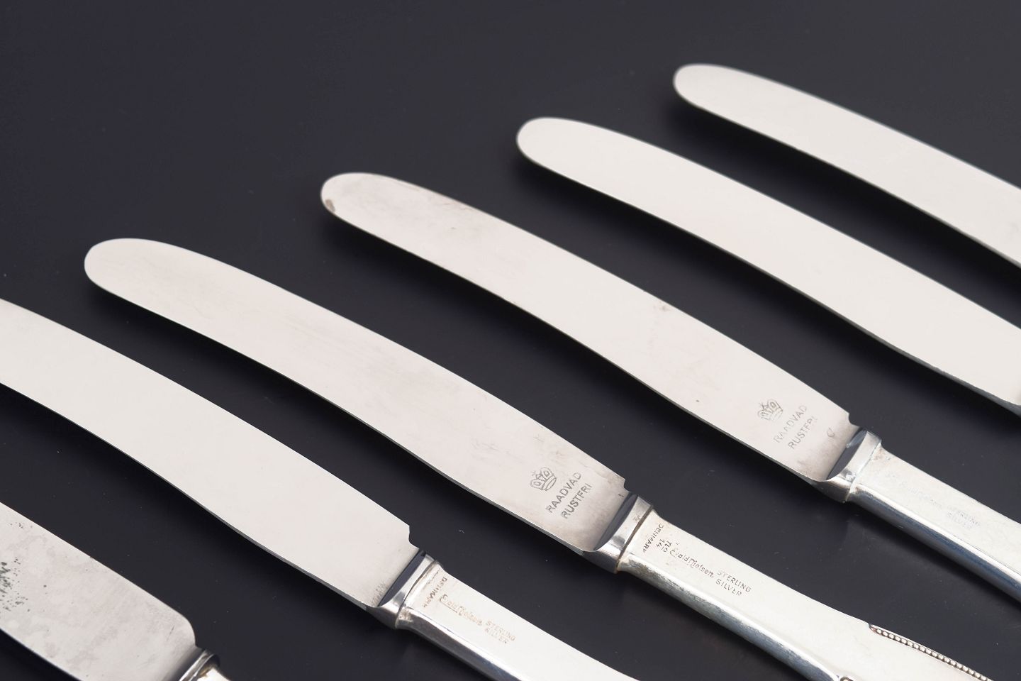 Elegante frokostknive i sterlingsølv og rustfrit stål. Model nummer 14 med klassisk, let afrundet skaftform med diskret perlekant og glat klinge. Fremstillet hos Evald Nielsen.
