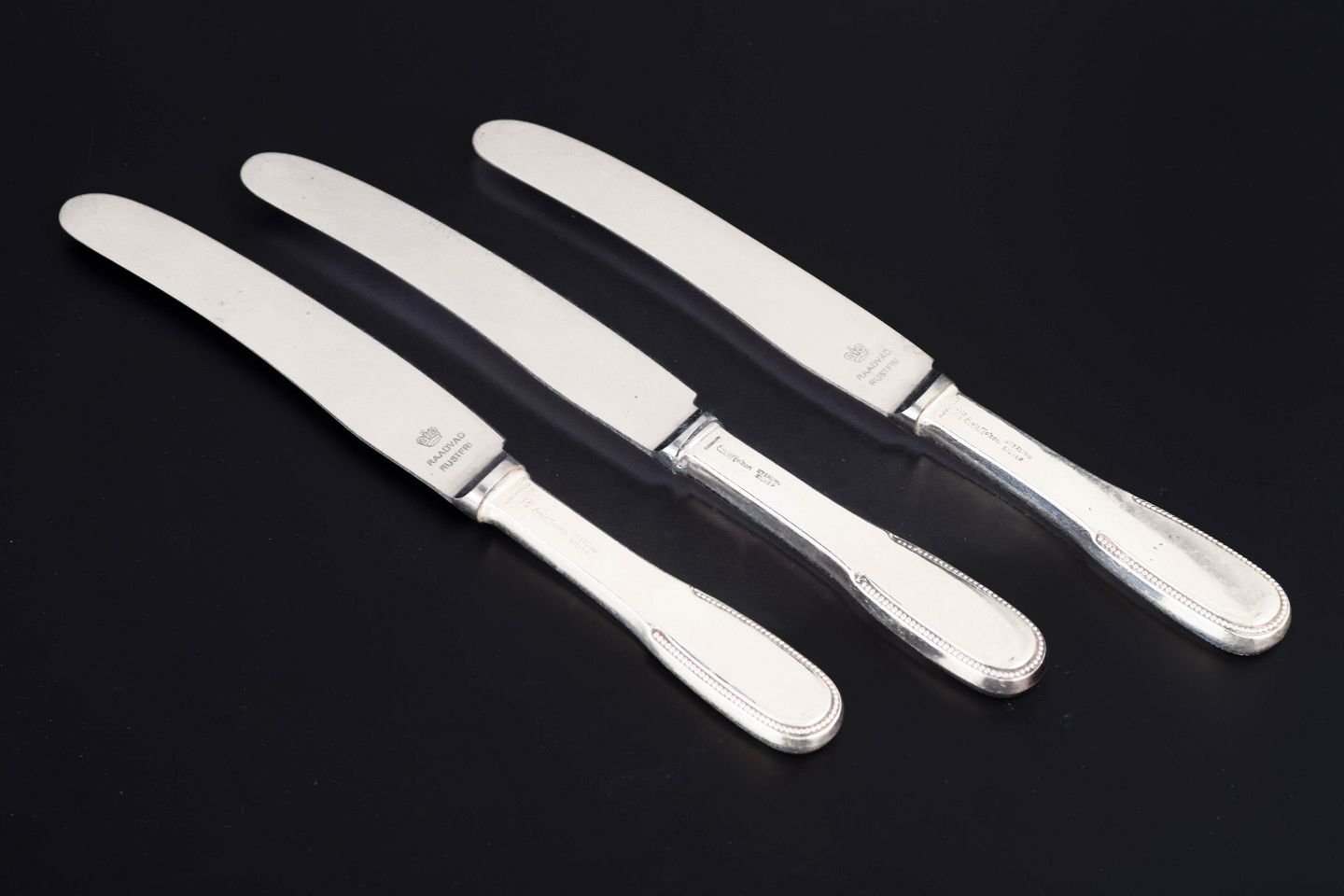 Elegante frokostknive i sterlingsølv og rustfrit stål. Model nummer 14 med klassisk, let afrundet skaftform med diskret perlekant og glat klinge. Fremstillet hos Evald Nielsen.