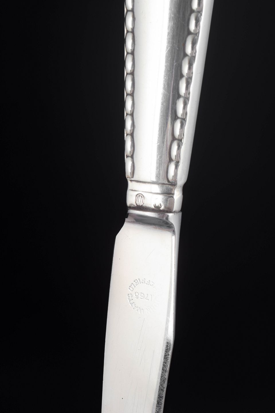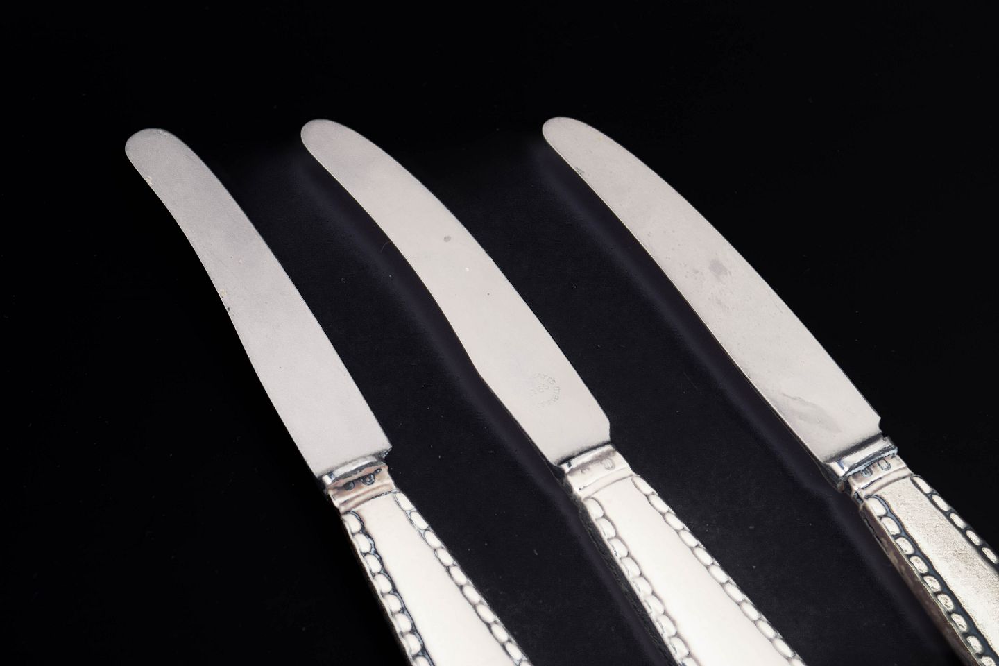 Sæt af tre knive i rustfrit stål og tretårnet sølv i mønstret Perle fra Georg Jensen. Skaftet er udformet med en karakteristisk perlerand langs kanten, et klassisk dekorativt motiv som giver bestikket et elegant og tidløst udtryk.