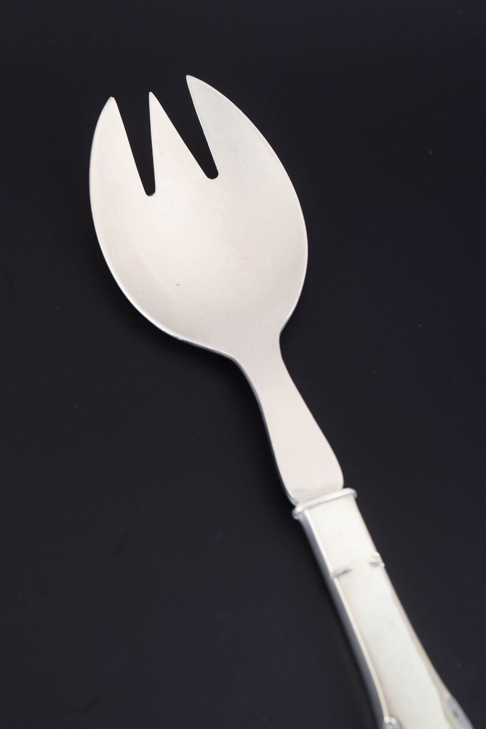 Elegant salatgaffel i sølv 830 og rustfrit stål. Model nummer 14 med klassisk, let afrundet skaftform med diskret perlekant. Fremstillet hos Evald Nielsen.