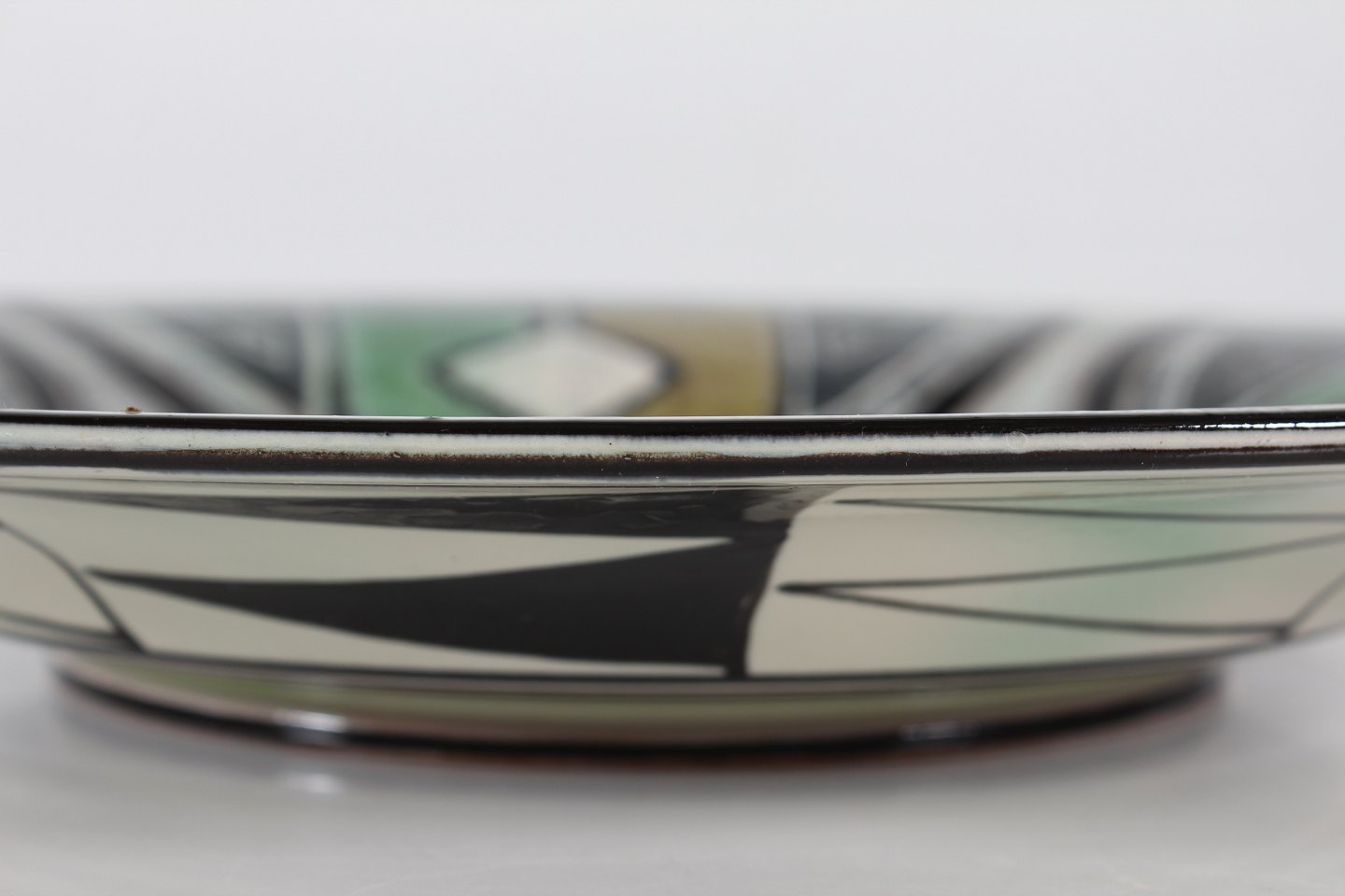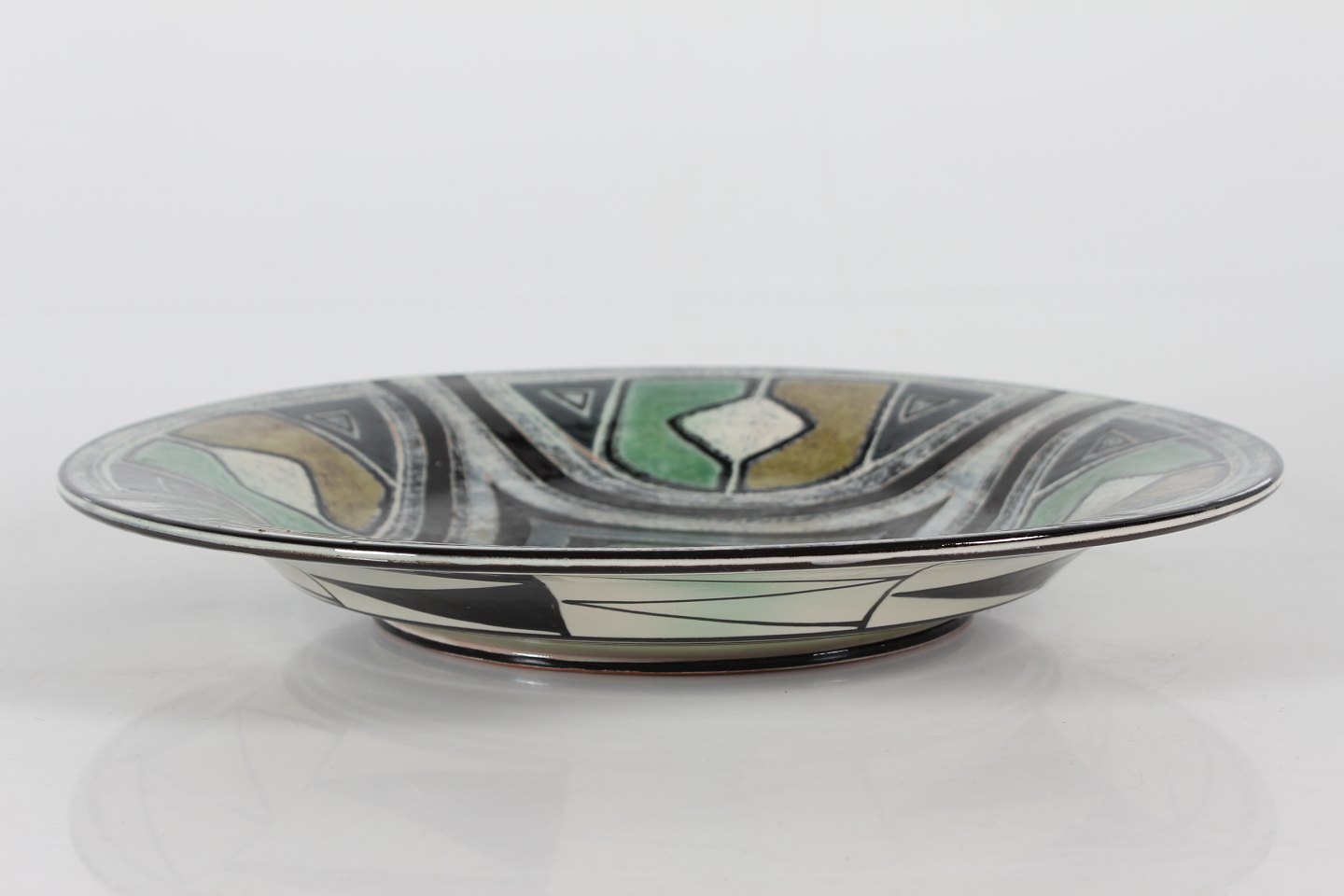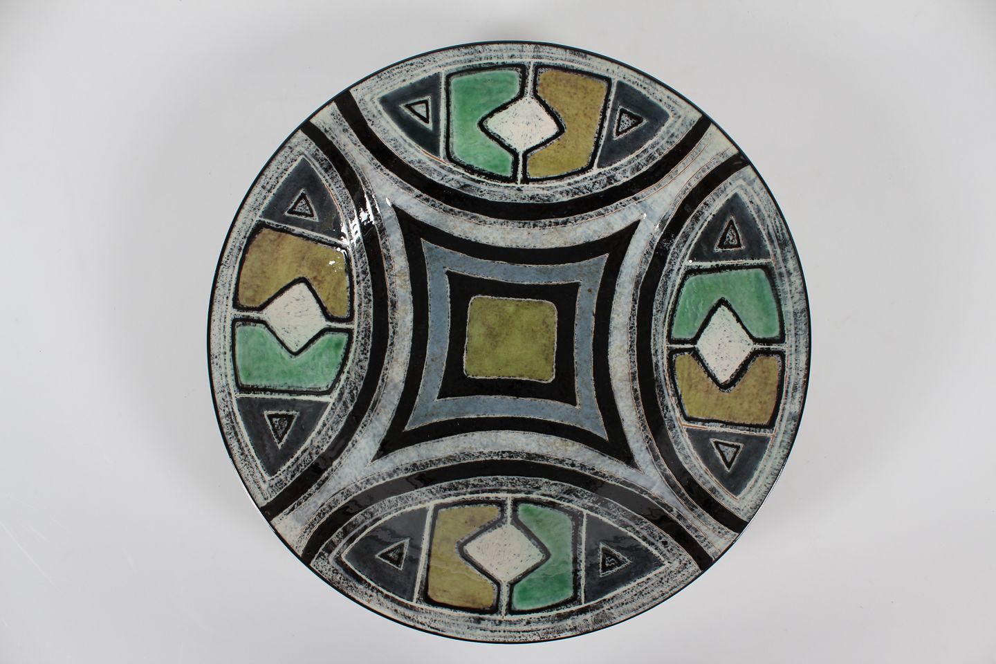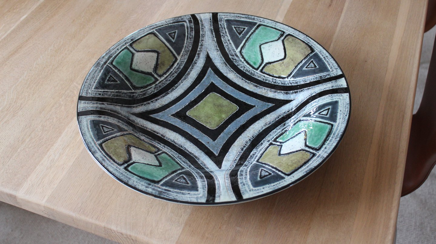 Stort cirkulært keramik fad med grafisk mønster