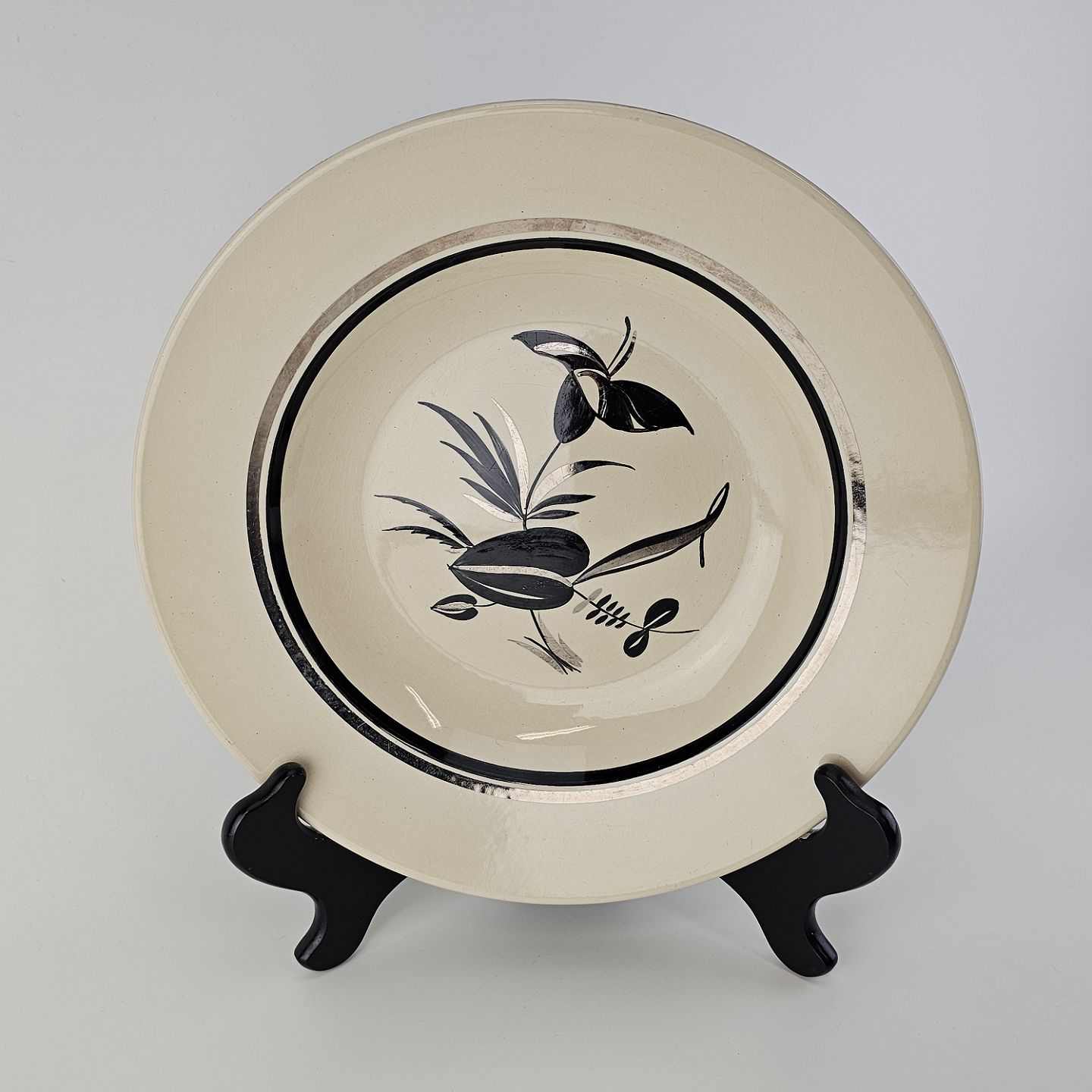 Råhvidt fajancestel i stelform E med dekoration af naturmotiver i sølv og sort farve.