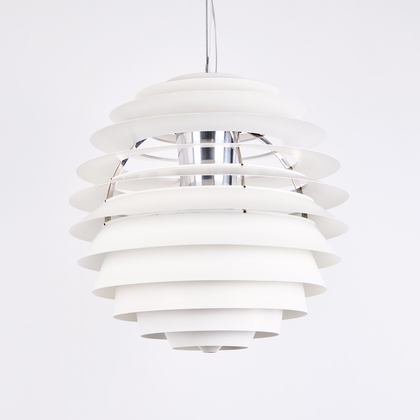 Ikonische Pendelleuchte, PH Louvre (früher PH Kugle genannt), entworfen von Poul Henningsen im Jahr 1957 für die Adventistenkirche in Skodsborg. Die Leuchte besteht aus 13 Lamellen, die auf einer inneren Konstruktion montiert sind und ein weiches und blendfreies Licht gewährleisten. Das kugelförmige Design sorgt für eine gleichmäßige Lichtverteilung und einen skulpturalen Ausdruck.