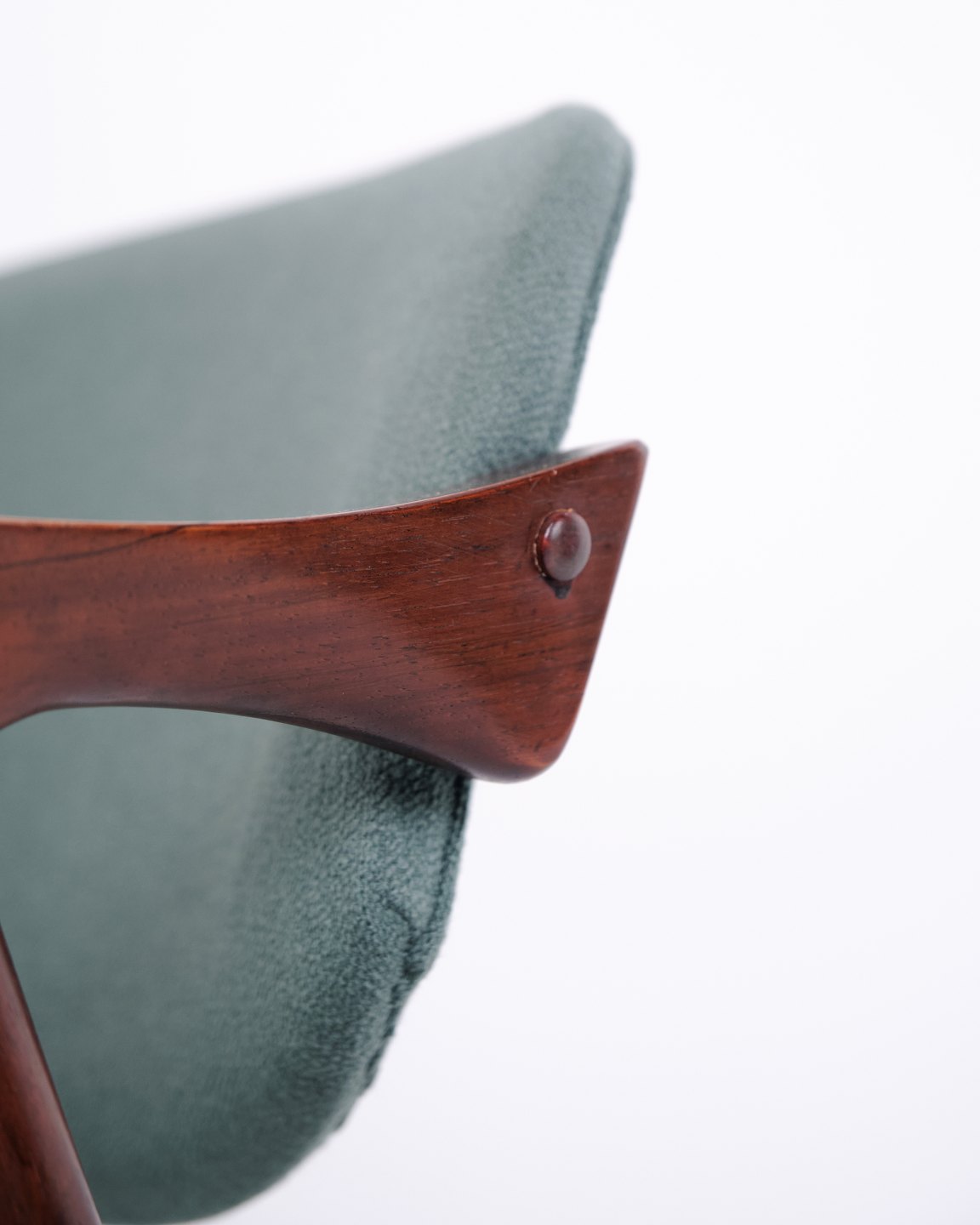Die Stühle wurden bei der Schou Andersen Möbelfabrik hergestellt und verfügen über Sitze mit türkisblaue Stoffpolsterung, die einen schönen Kontrast zum warmen Ton des Palisanders bildet.