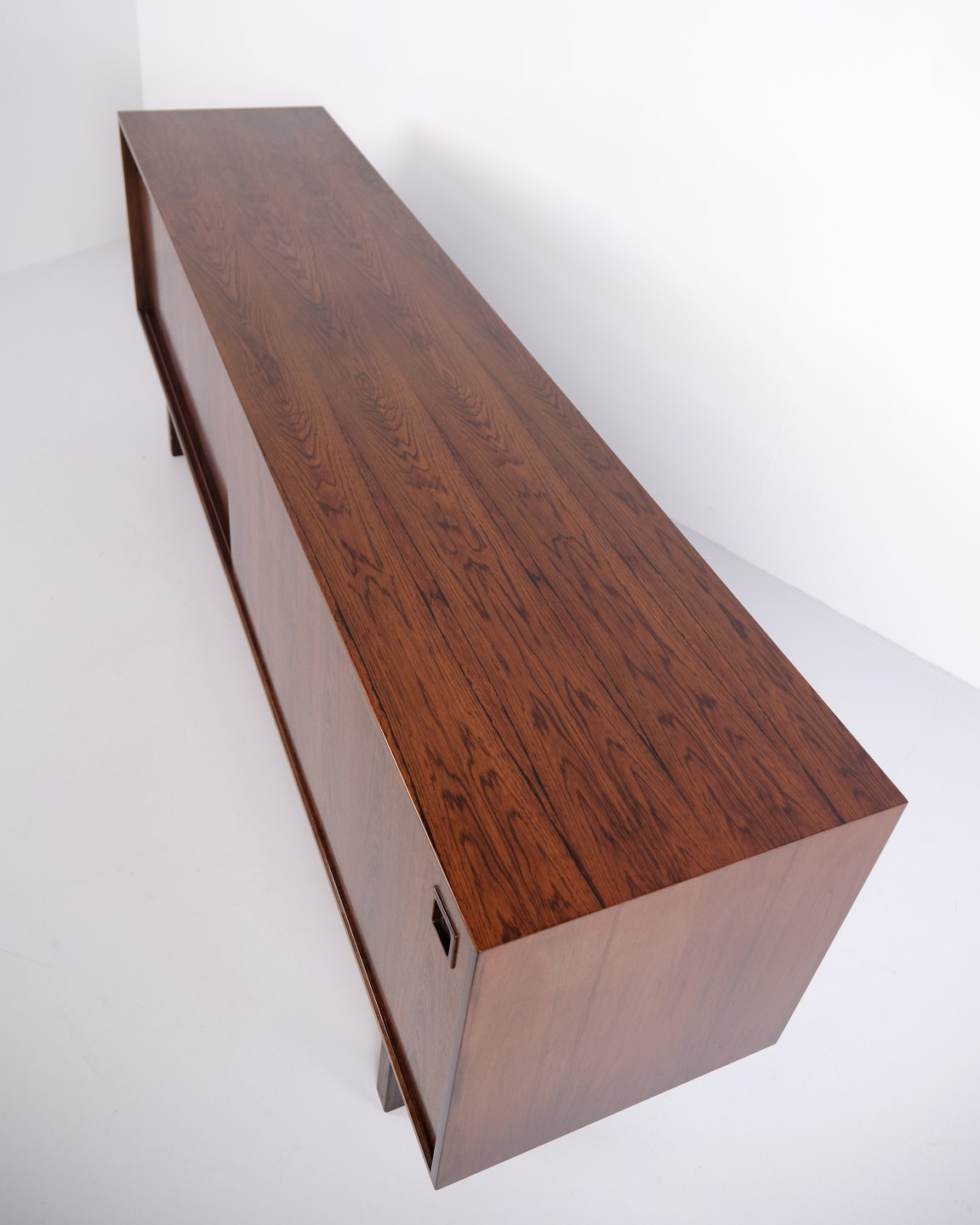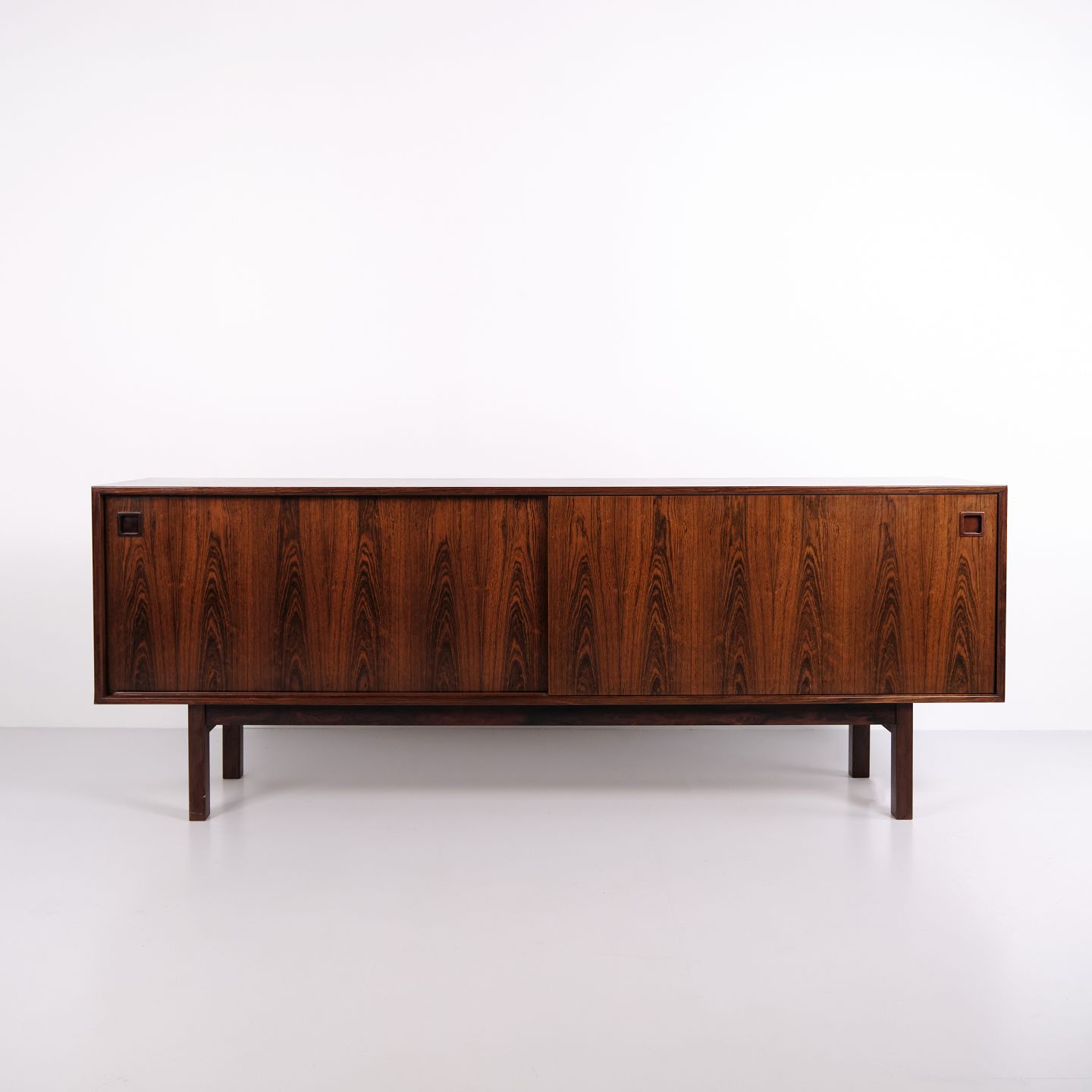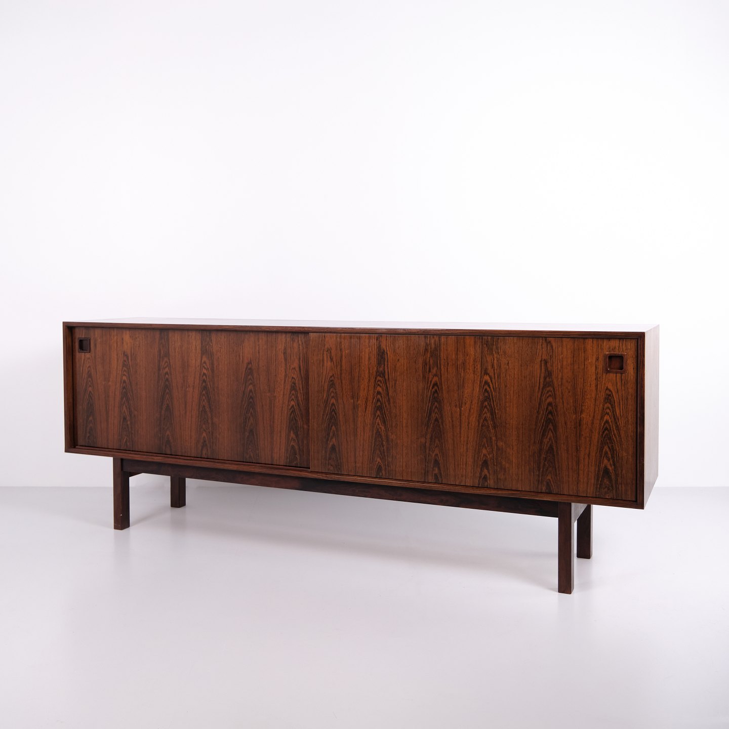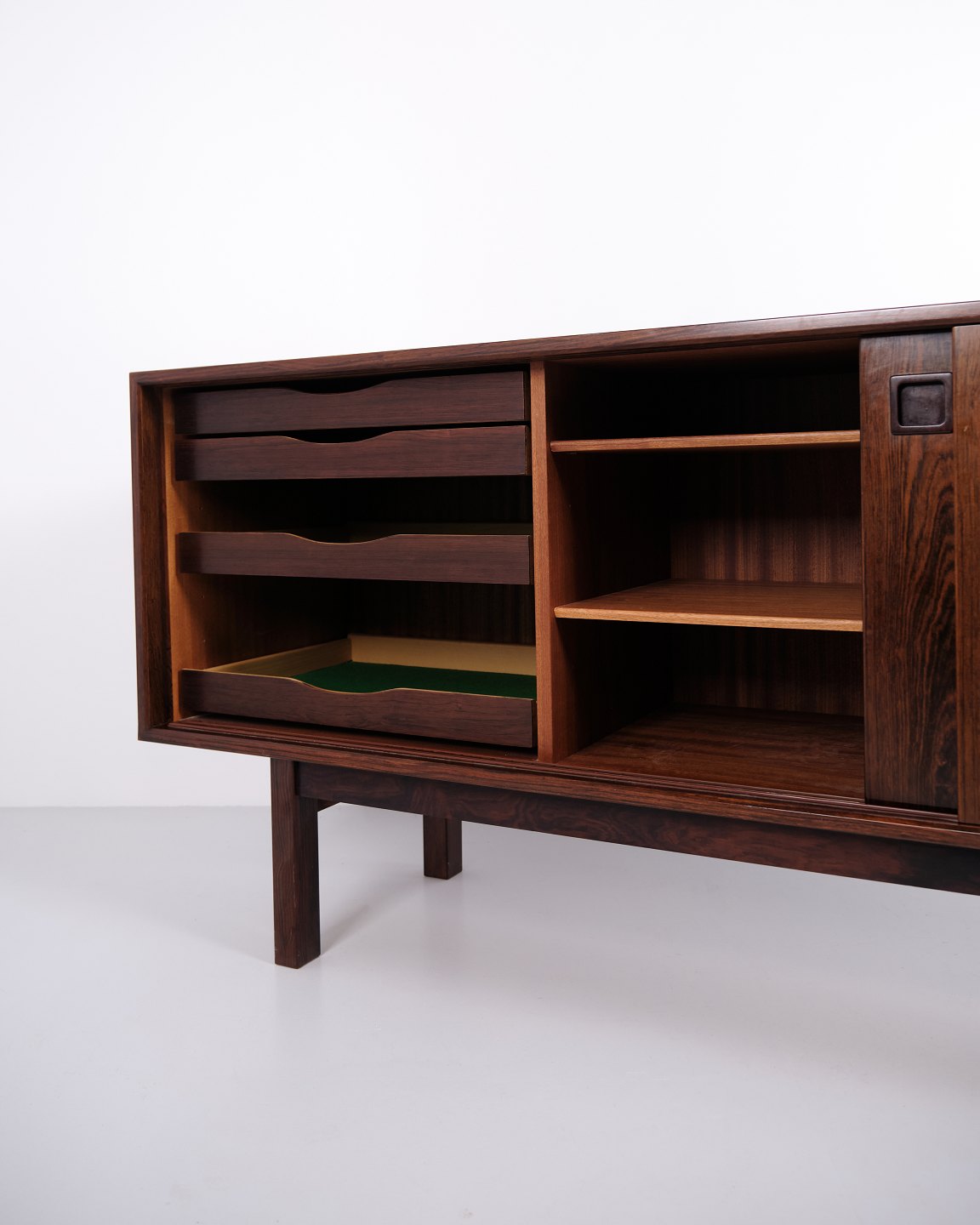 Das Sideboard verfügt über zwei Schiebetüren mit eingelassenen Griffen aus massivem Palisander. Im Inneren befinden sich vier Auszugsschubladen sowie Einlegeböden, die großzügigen Stauraum bieten.