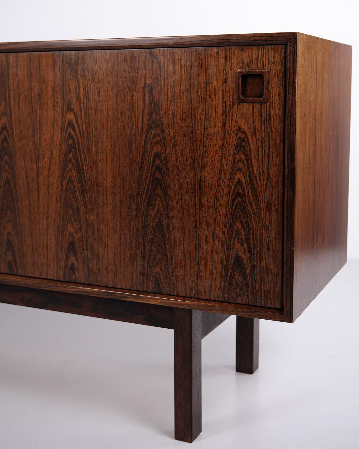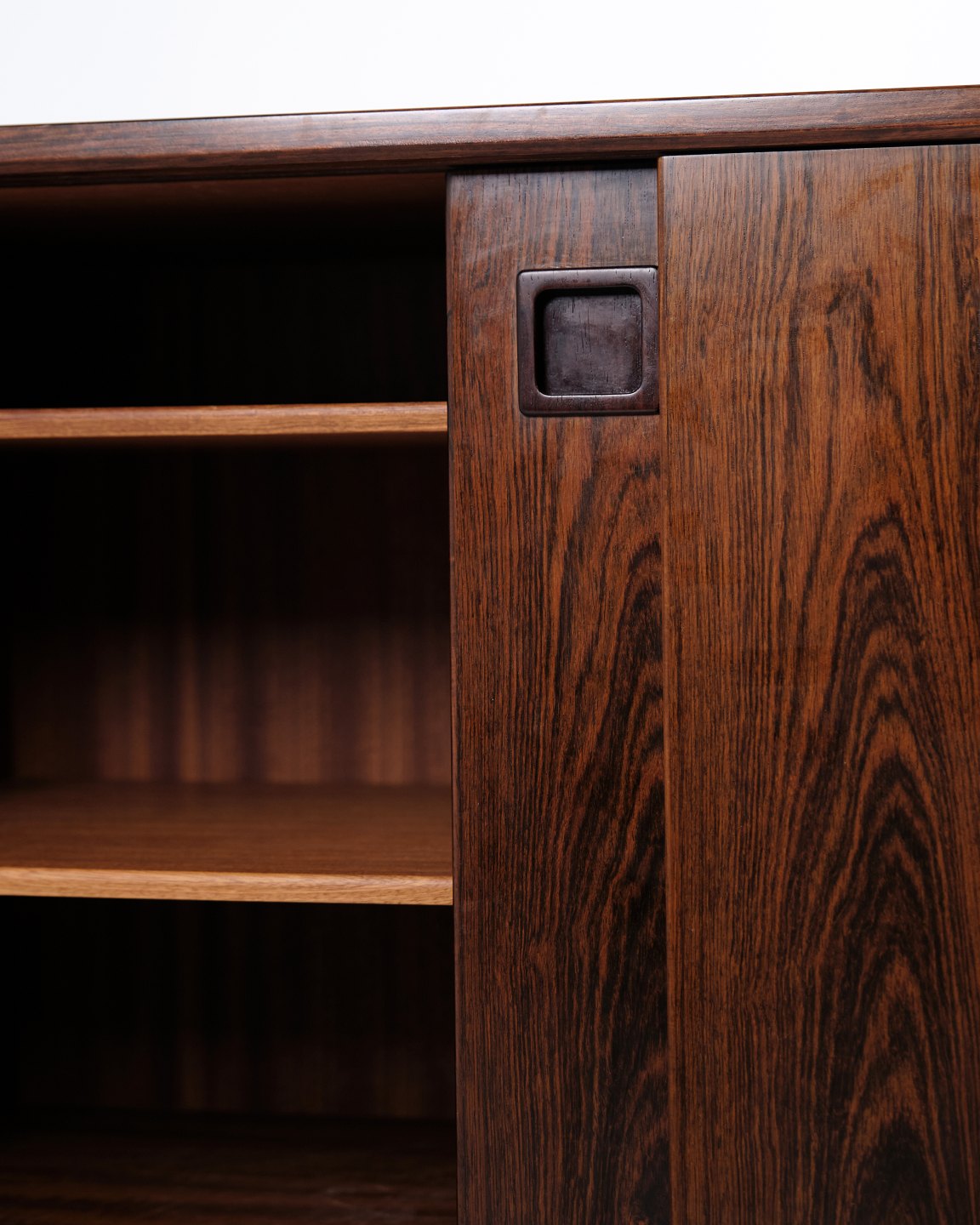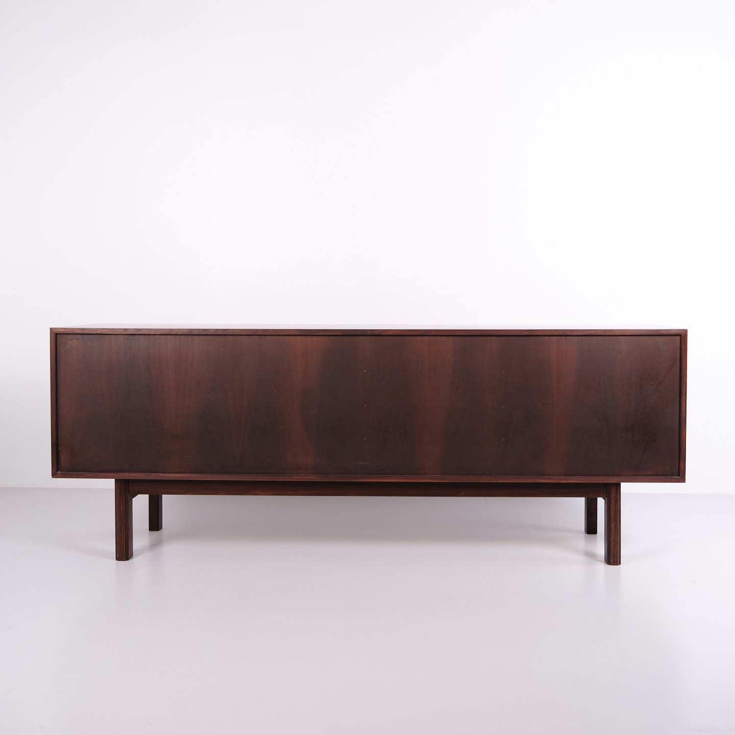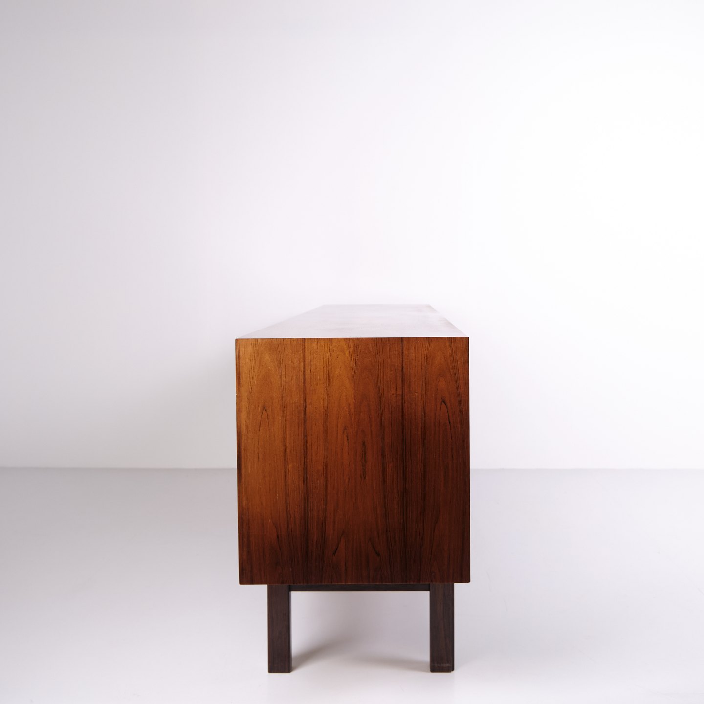 Das Sideboard verfügt über zwei Schiebetüren mit eingelassenen Griffen aus massivem Palisander. Im Inneren befinden sich vier Auszugsschubladen sowie Einlegeböden, die großzügigen Stauraum bieten.
