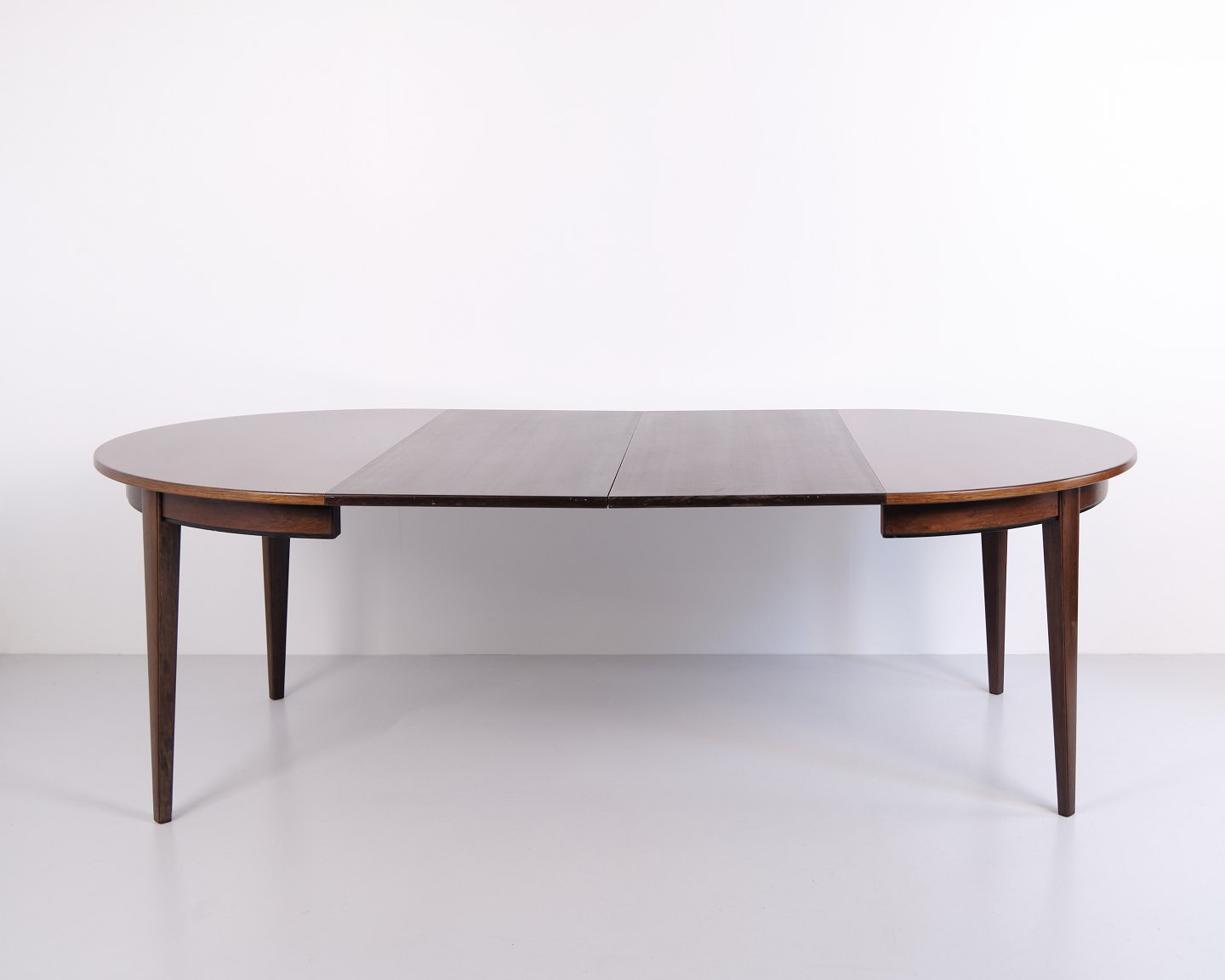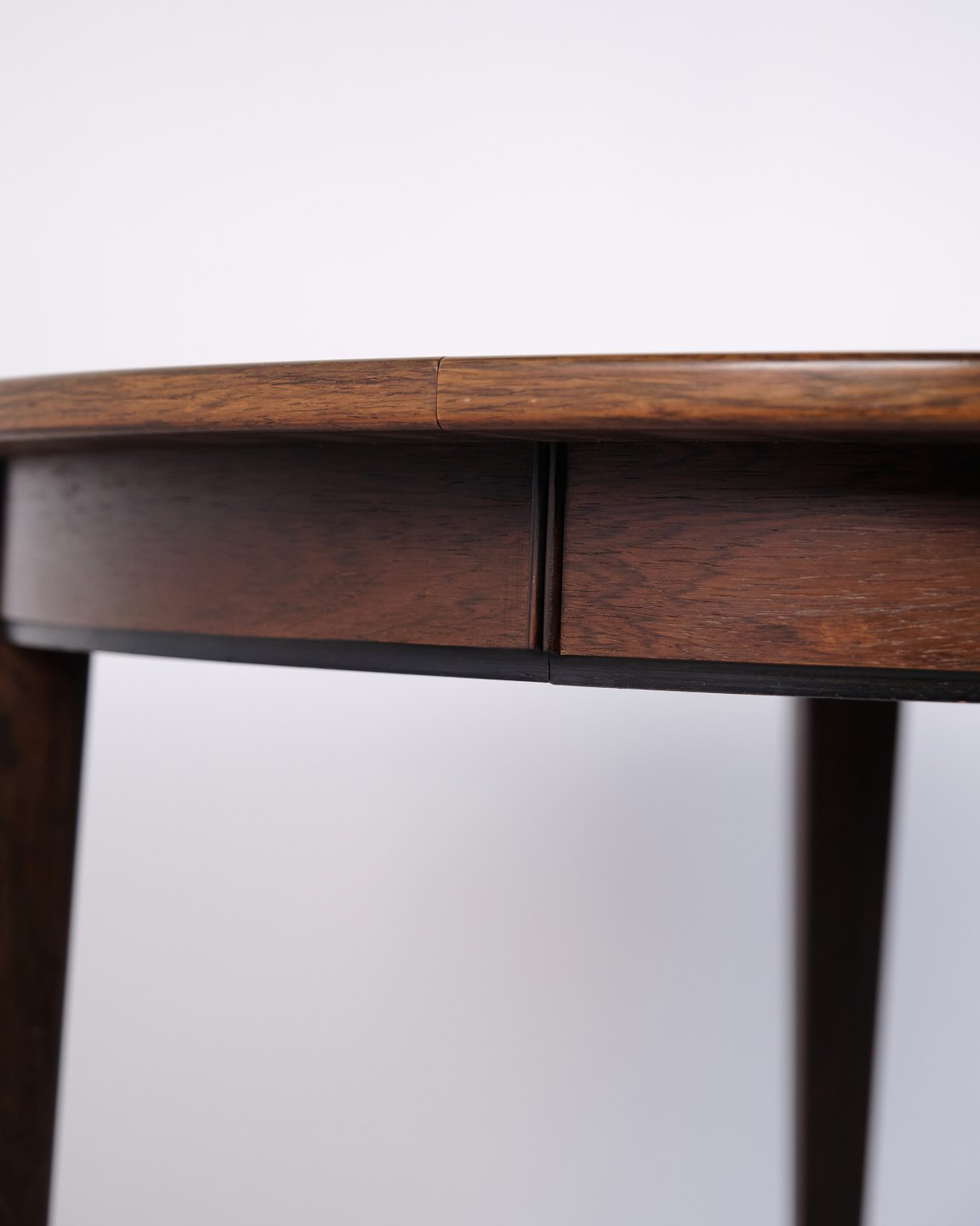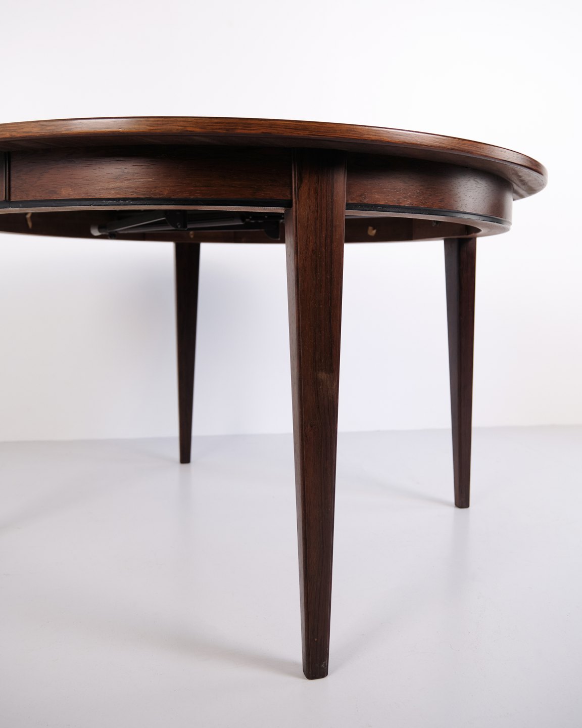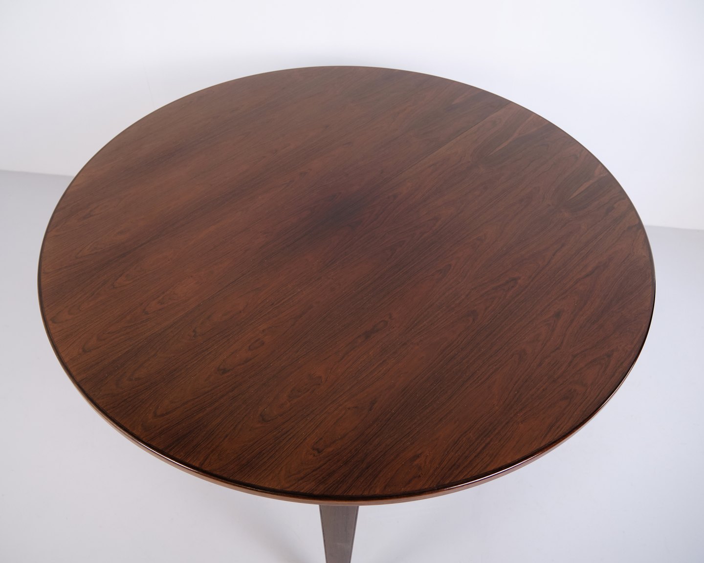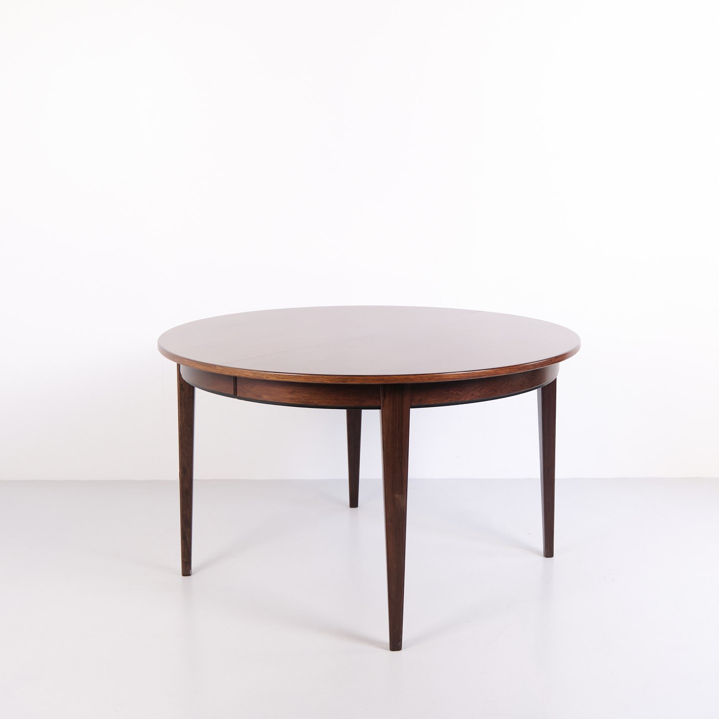 Runder Esstisch Modell 55, entworfen und hergestellt von Omann Jun im Jahr 1964. Der Tisch ist aus Palisanderfurnier gefertigt und steht auf eleganten, konischen Beinen, die typisch für das dänische Möbeldesign dieser Zeit sind. Die runde Form und das schlichte Design verleihen dem Tisch einen klassischen und zeitlosen Ausdruck.