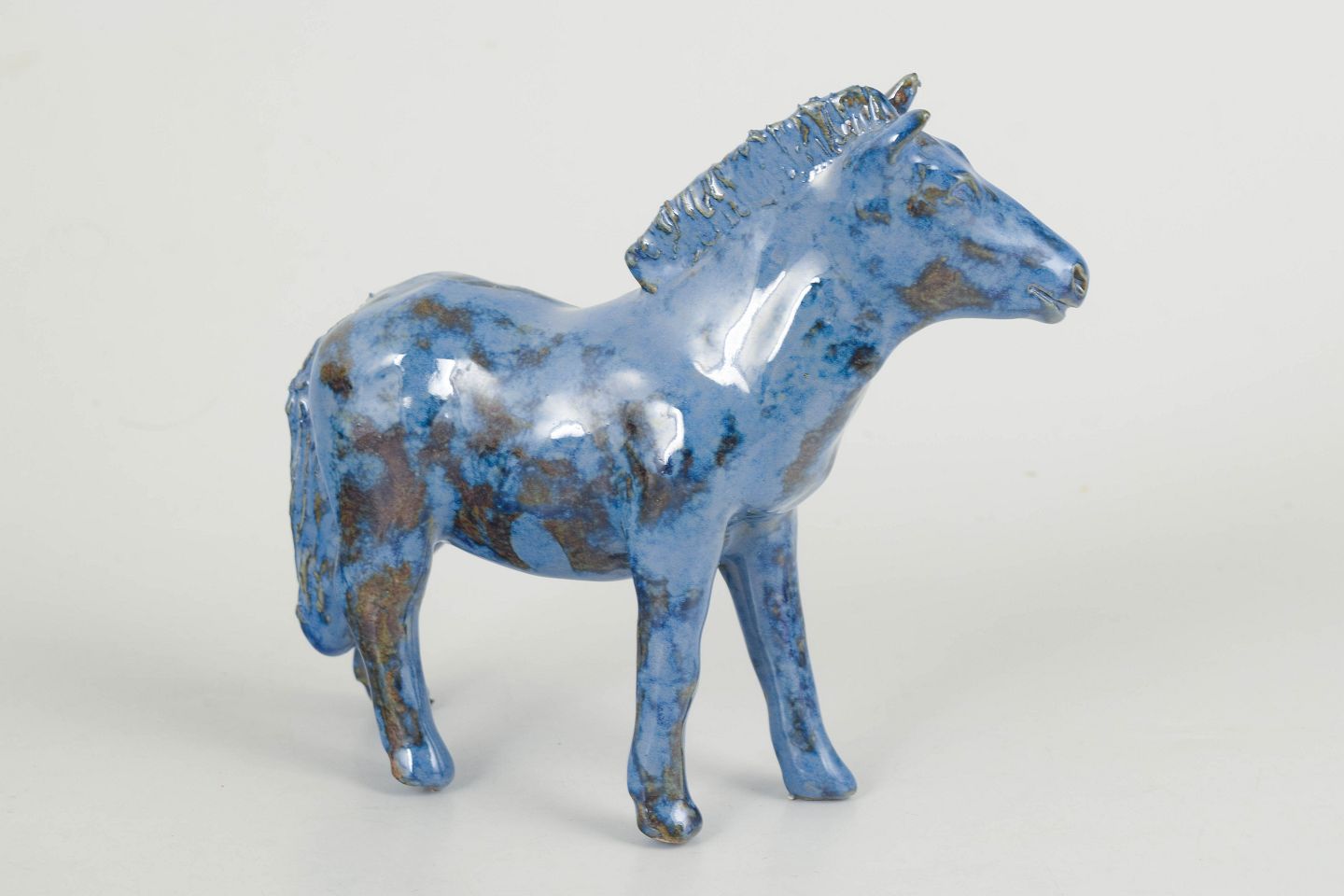 Unik keramisk figur forestillende et føl udført i stentøj med blank glasur i blå toner med brunlige nuancer. Figuren er modelleret med en naturlig kropsholdning og detaljeret manke og hoved, hvilket giver et levende og karakterfuldt udtryk. Usigneret unika fra 1970’erne.