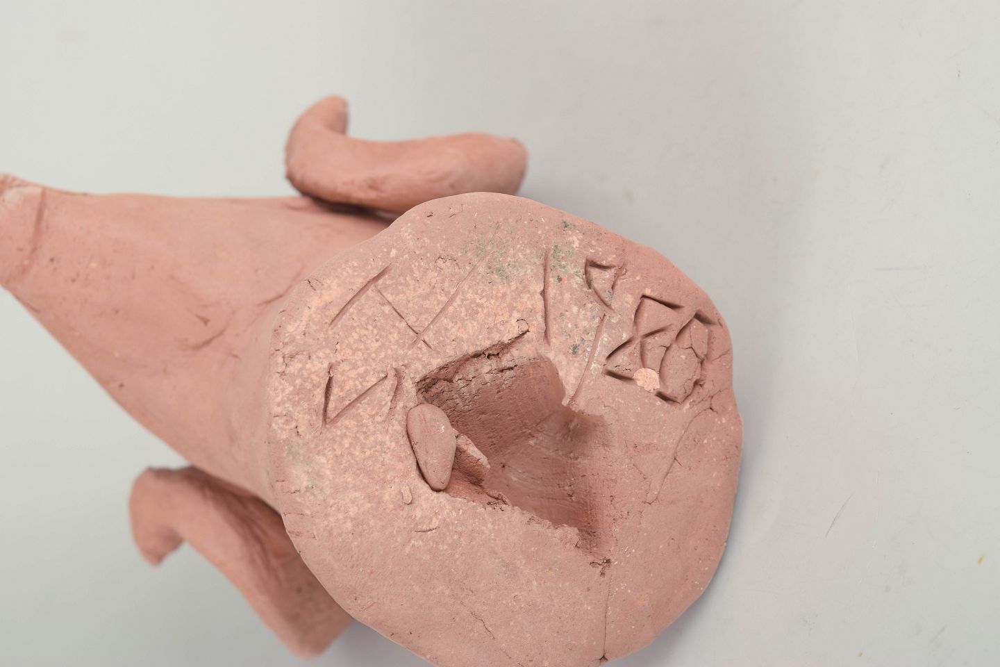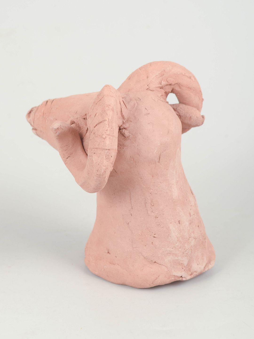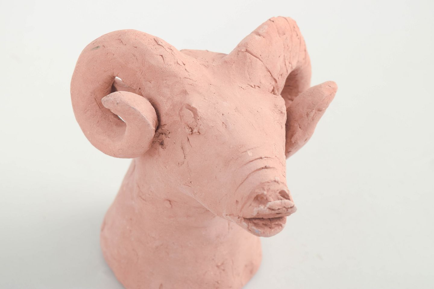 Unik keramisk figur forestillende en vædder udført i uglaseret ler med rå, skulpturel overflade. Figuren er modelleret med markante buede horn og et stiliseret hoved, hvilket giver et kraftfuldt og karakterfuldt udtryk. Signeret.