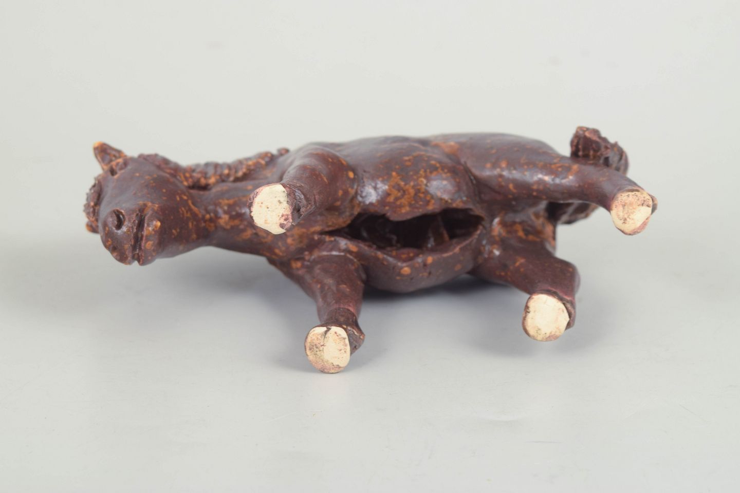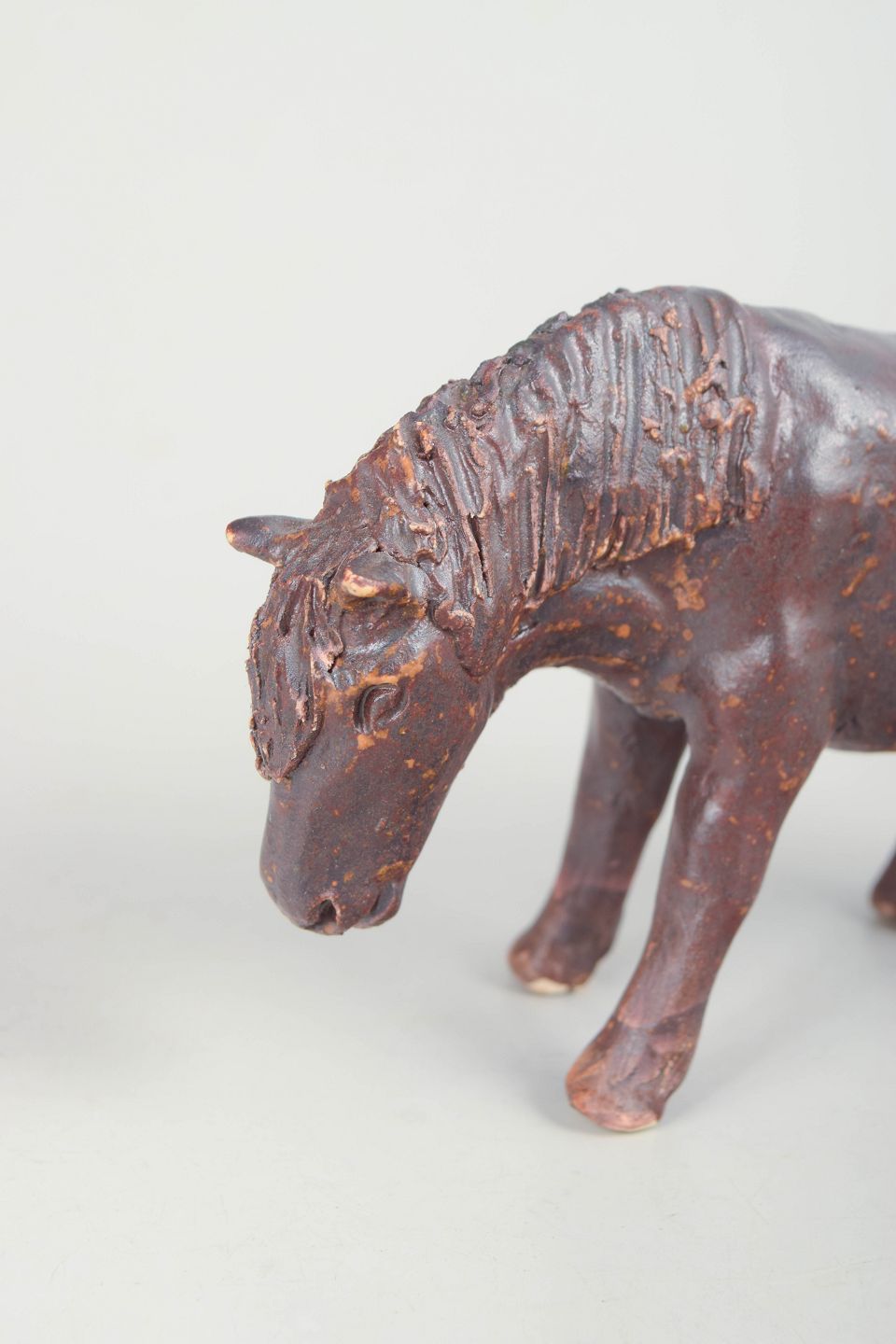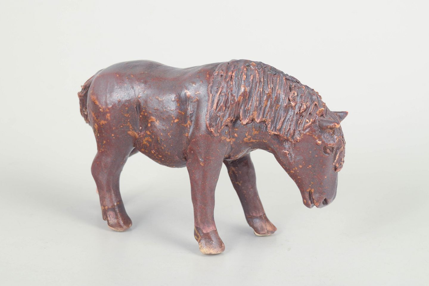 Unik keramisk figur forestillende en pony udført i stentøj med mørk brun glasur og rustfarvede nuancer. Figuren er modelleret med naturlig kropsholdning og fint detaljeret manke og hoved, hvilket giver et levende og karakterfuldt udtryk. Usigneret unika fra 1970’erne.