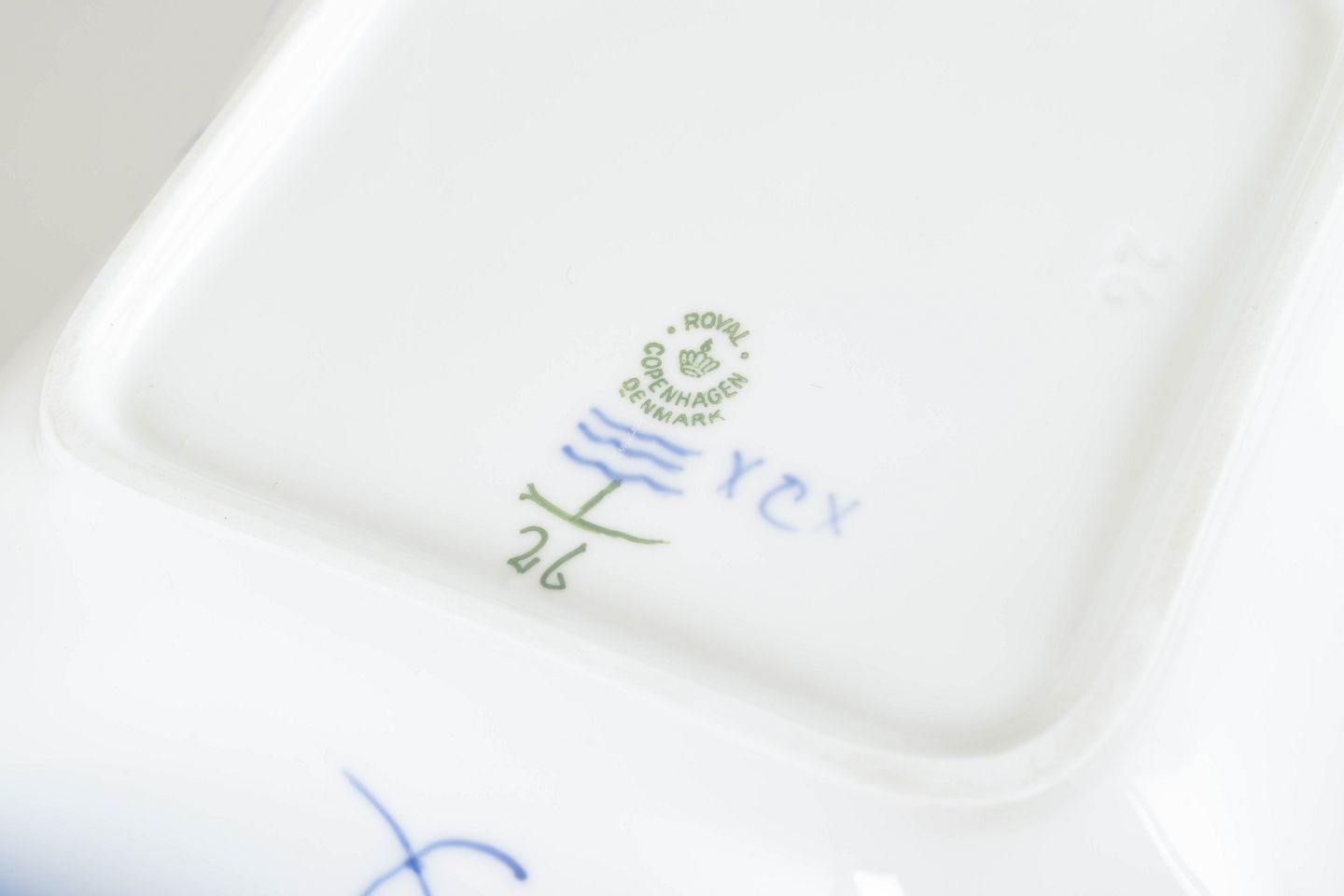 Text zugänglich auf Dänische: Royal Copenhagen Musselmalet Riflet, firkantet skål.