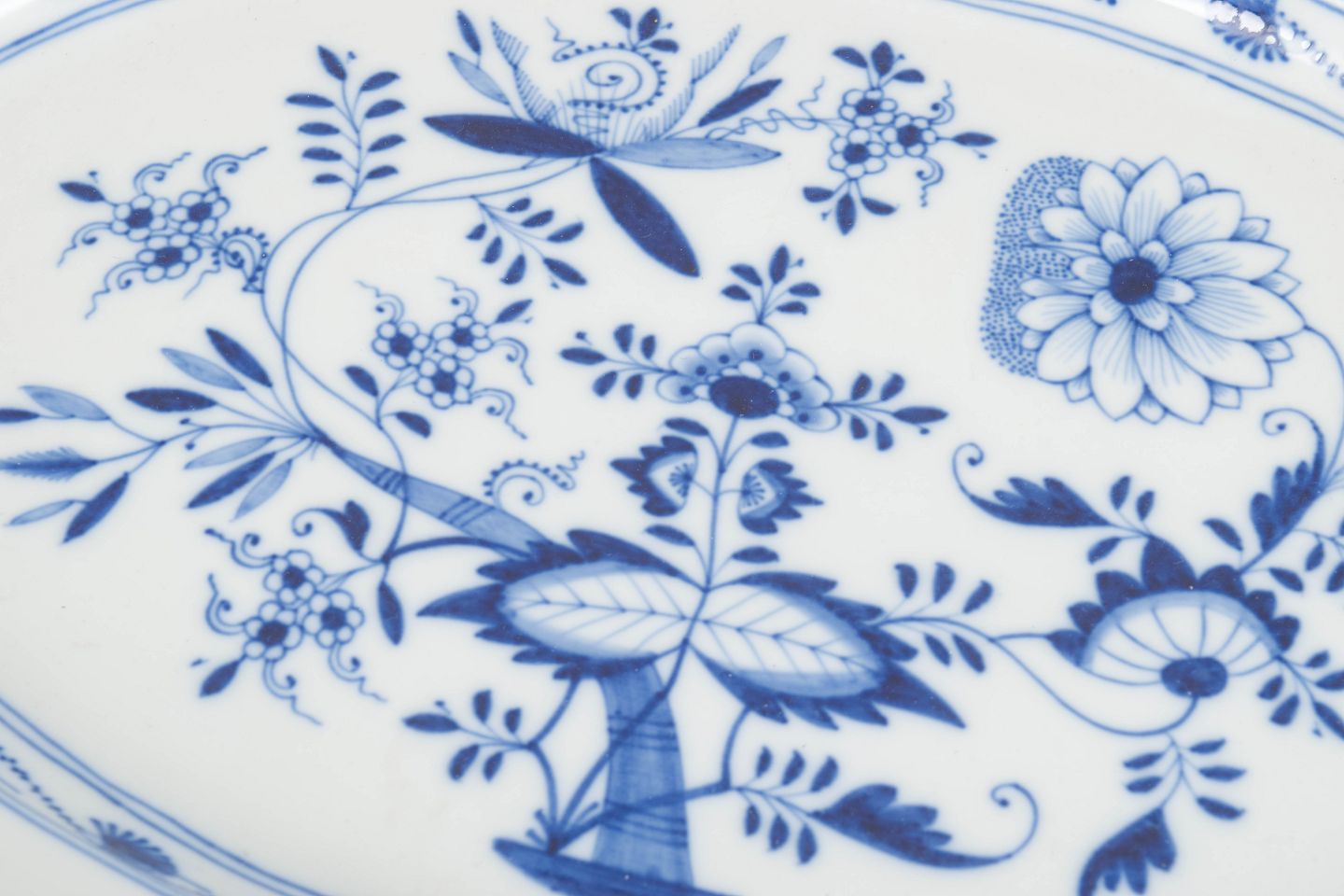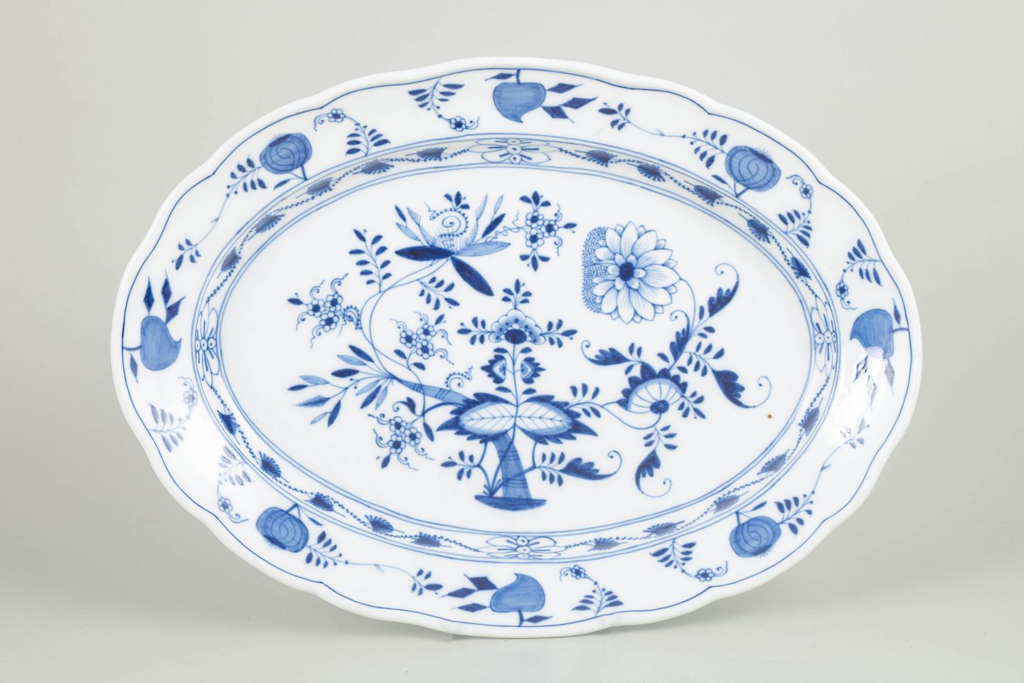Stort ovalt serveringsfad i porcelæn dekoreret med det klassiske håndmalede løgmønster i koboltblå underglasur. Formen har en elegant svungen fane med kontureret rand og en central blomsteropsats omgivet af stiliserede blomster- og frugtmotiver. Modellen blev fremstillet hos Meissen i begyndelsen af 1900-tallet og er mærket på undersiden med de karakteristiske krydsede sværd, annulleret med to indridsede streger.