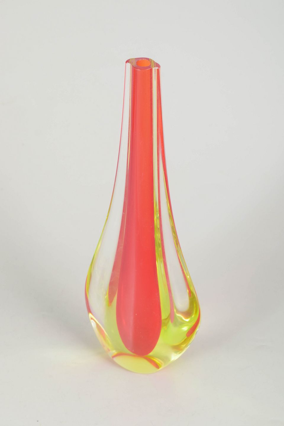 Elegant kunstglasvase i klart glas med indkapslet rød kerne og blød dråbeformet silhuet, udført i karakteristisk Murano-stil med lang slank hals.