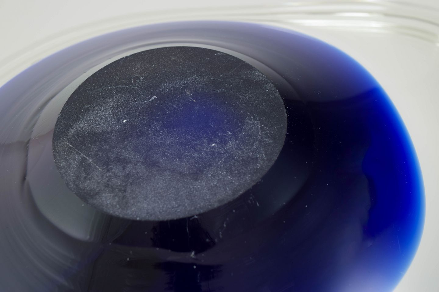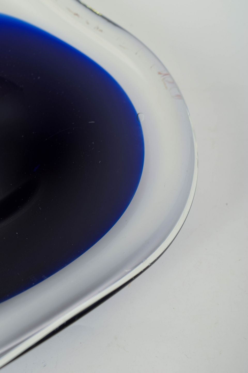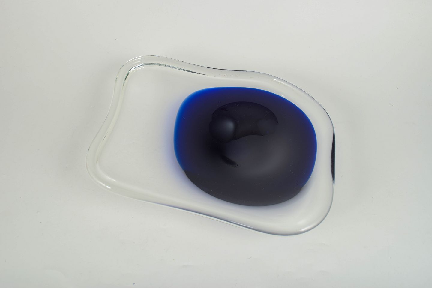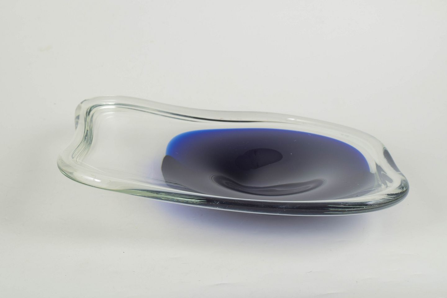 Aflang kunstglasskål i klart glas med dyb blå indfarvning i midten og elegant bølgende form, udført i karakteristisk Murano-stil fra midten af det 20. århundrede.