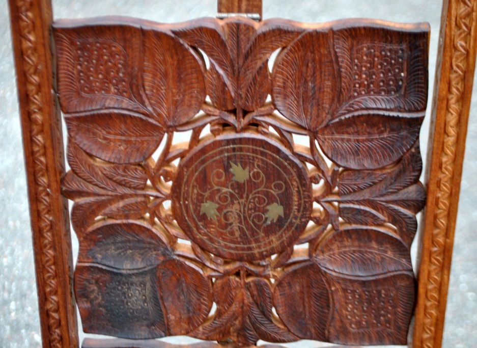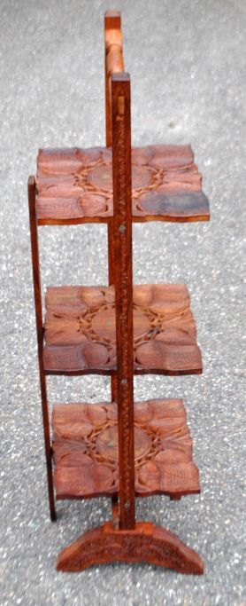 Tortenständer aus Teakholz, 19. Jahrhundert. Indien. Dreistöckig mit Schnitzereien von Blumen und Blättern. Mit Messingeinlagen in Blumenform. Höhe: 80,5 cm. Breite: 27,5 cm. Tiefe: 24 cm.
