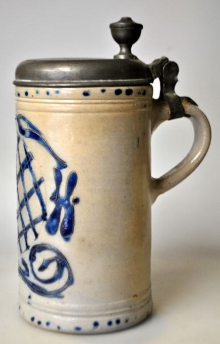 Deutscher Westenwälder Krug, 1853, Steinzeug, graue Salzglasur. Mit manganvioletten Verzierungen. Mit Zinndeckel und -ausguss. Graviert: FWH 1853. Höhe: 23 cm.