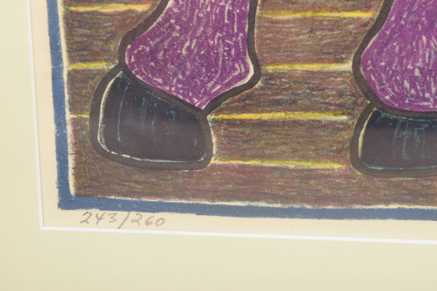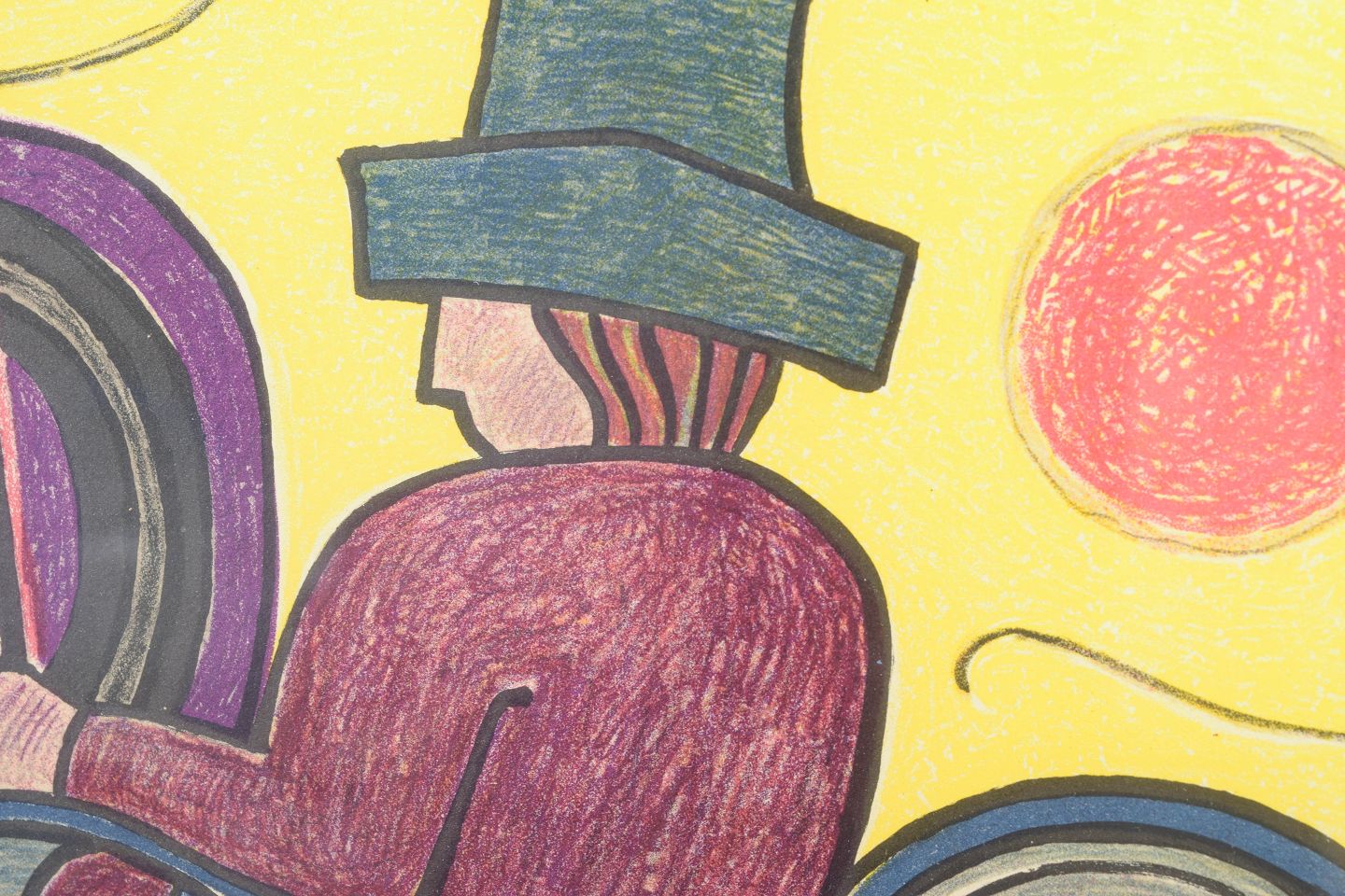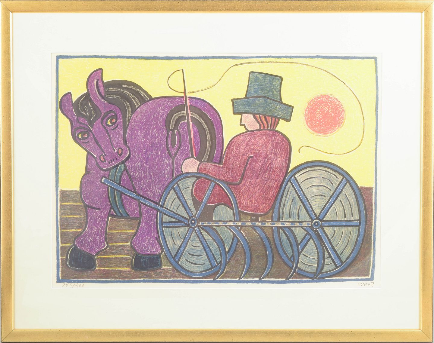 Farverig grafisk komposition med figurativt motiv af mand i hestevogn udført som farvelitografi i kunstnerens karakteristiske naive og symbolfyldte stil, signeret i blyant og nummereret 243/260.