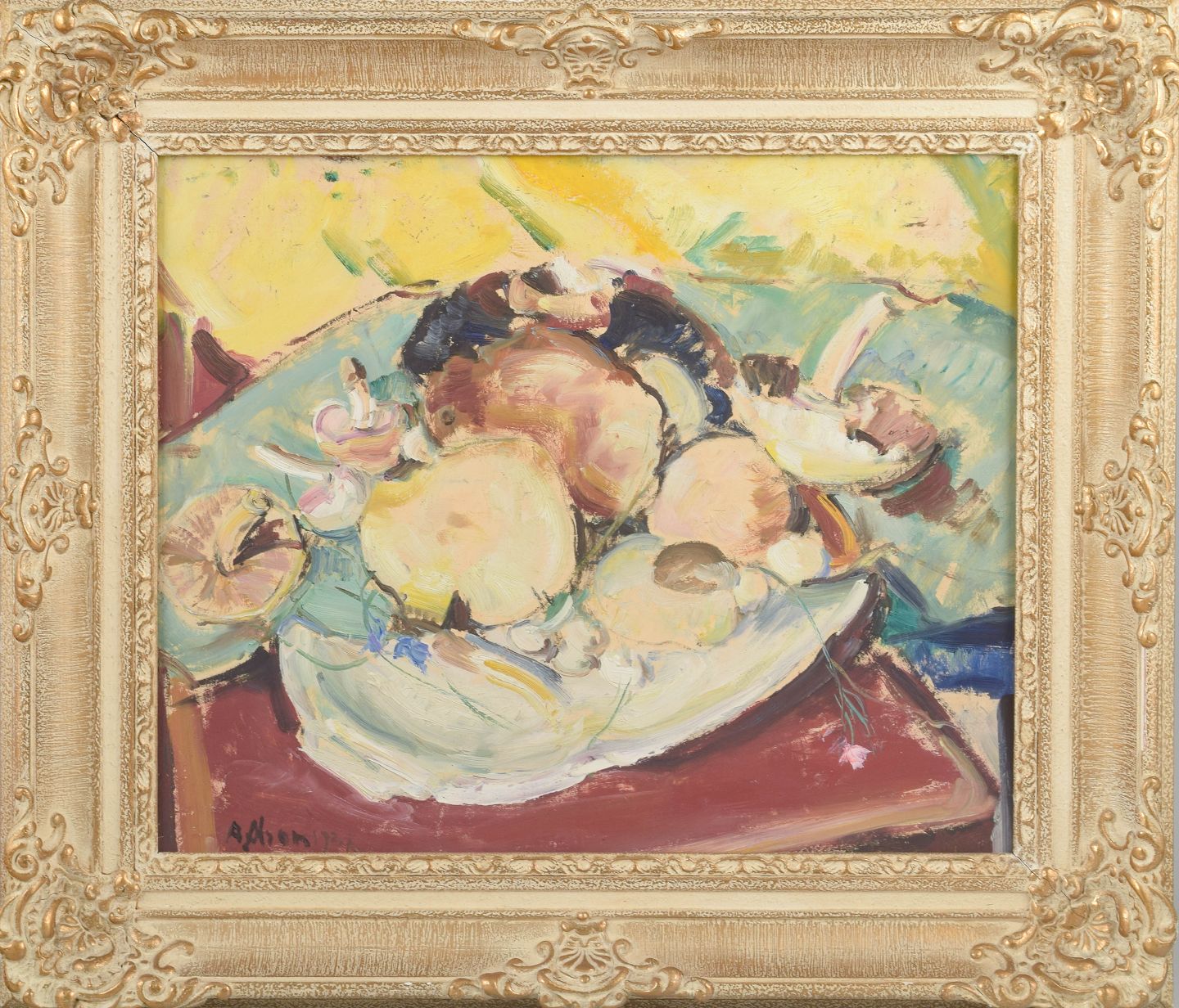 Ekspressivt stilleben med svampe arrangeret på fad, udført med brede og frie penselstrøg i varme gule, grønne og jordfarvede nuancer.