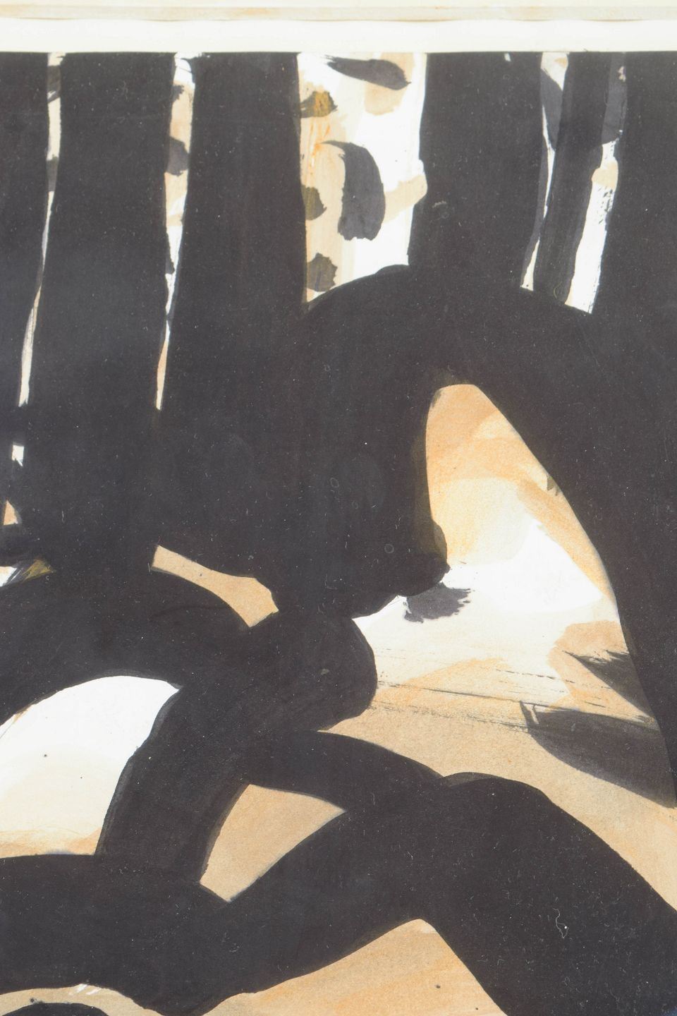 Abstrakt komposition med kraftige sorte penselstrøg og organiske former udført i mixed media på papir. Værket med titlen “Ljus glänta” er signeret og dateret 1987.