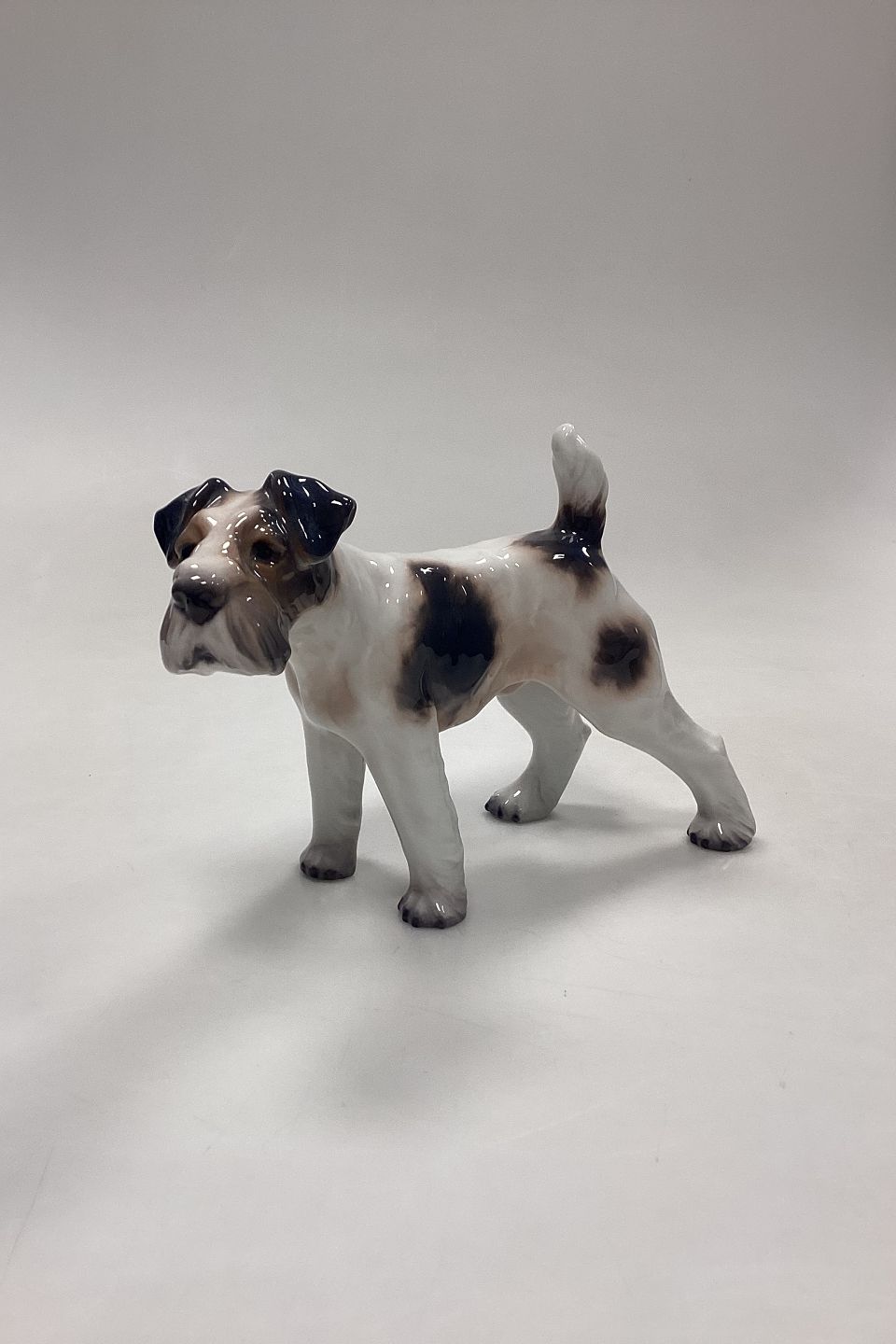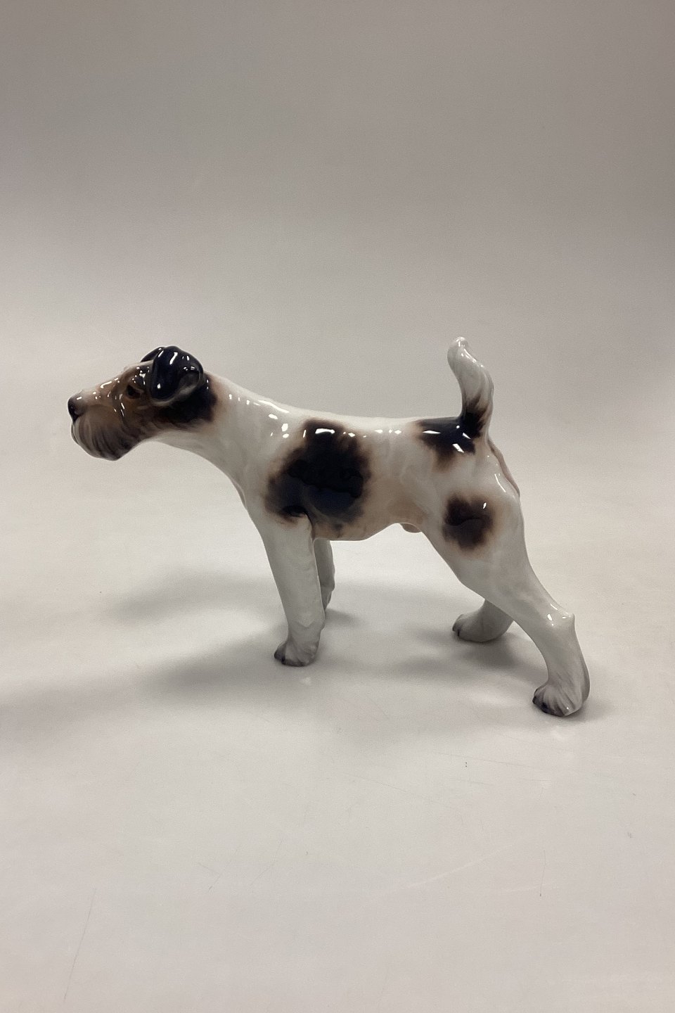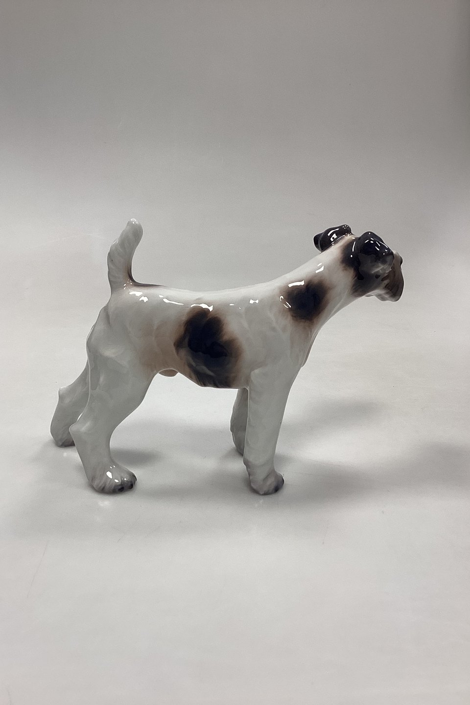 Dahl Jensen Figur - Ruhåret Foxterrier No. 1009. Hvid med mørke aftegninger.