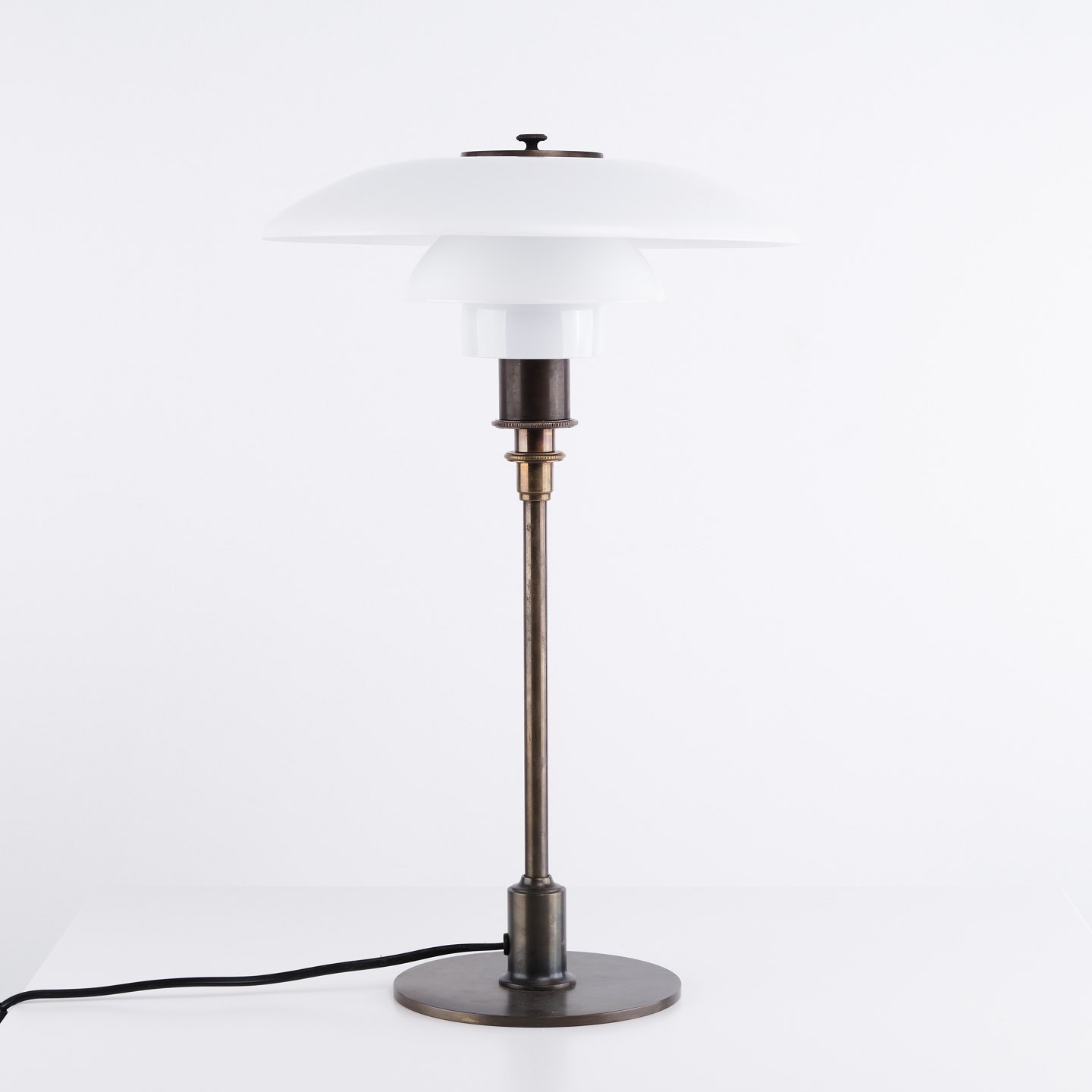 PH 3/2 Treph Tischlampe, entworfen von Poul Henningsen und als Jubiläumsmodell im Jahr 1994 von Louis Poulsen herausgegeben. Die Lampe ist mit einem brünierten Gestell und klassischen Schirmen aus weißem Opalglas ausgeführt, die ein weiches und blendfreies Licht gewährleisten. Das ikonische Dreischirmsystem wurde für eine optimale Lichtverteilung entwickelt und ist ein zentrales Element in Henningsens Designphilosophie.