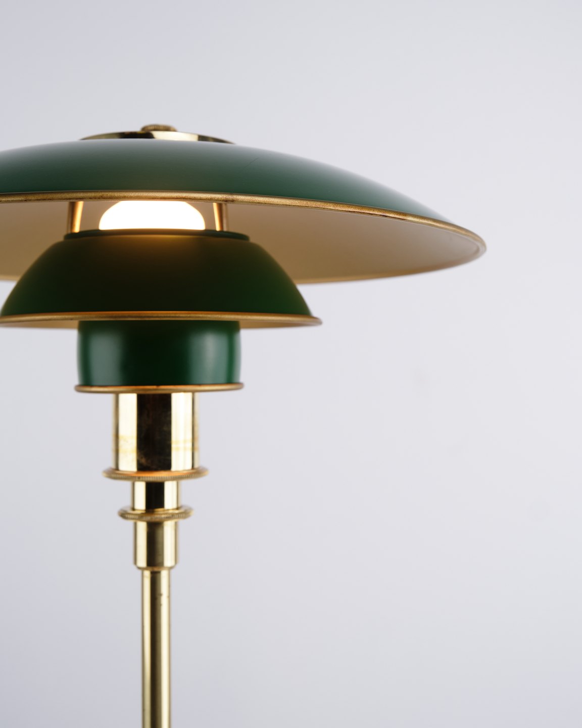 PH 3/2 Tischlampe, entworfen von Poul Henningsen und als Jubiläumsausgabe im Jahr 1996 von Louis Poulsen herausgegeben. Die Lampe ist aus Messing gefertigt und mit grünen Metallschirmen ausgestattet, was ihr einen markanten und klassischen Ausdruck verleiht. Das Modell wurde nur für einen begrenzten Zeitraum produziert und ist auch in einer Variante mit roten Metallschirmen erhältlich.