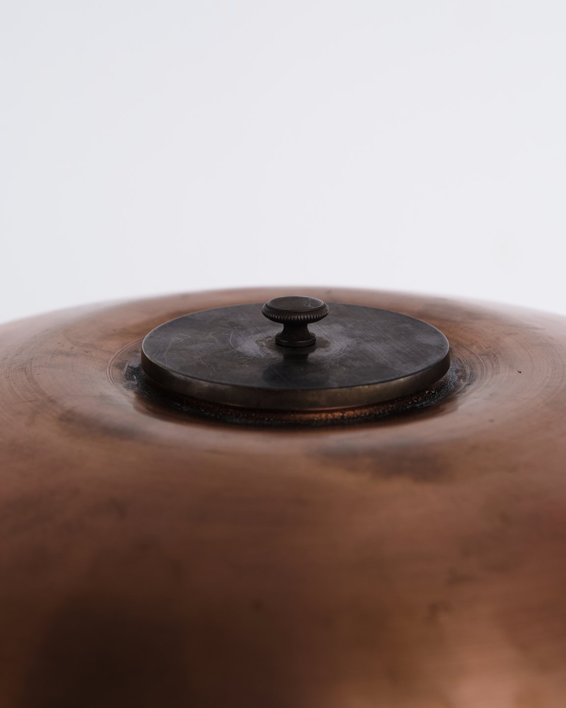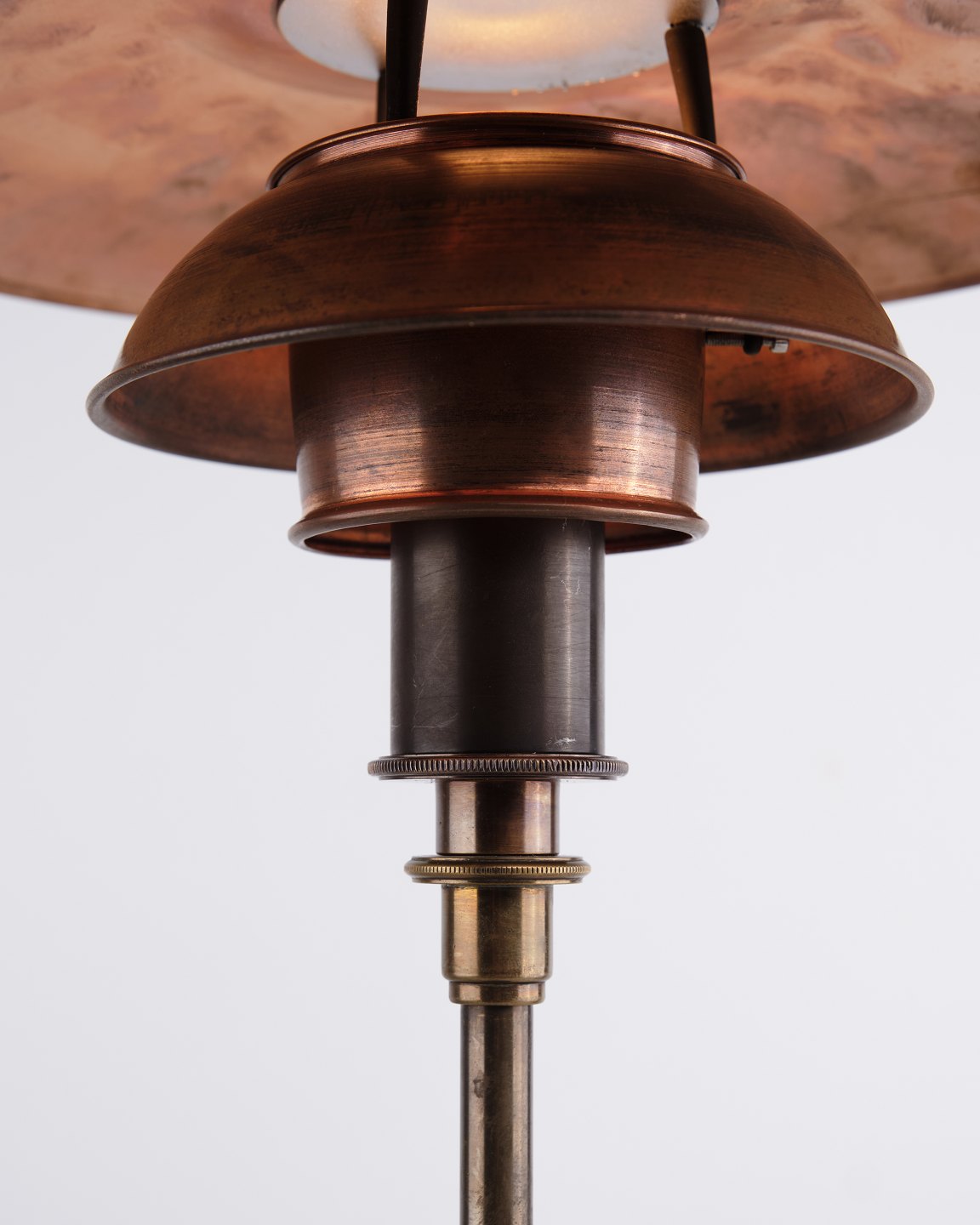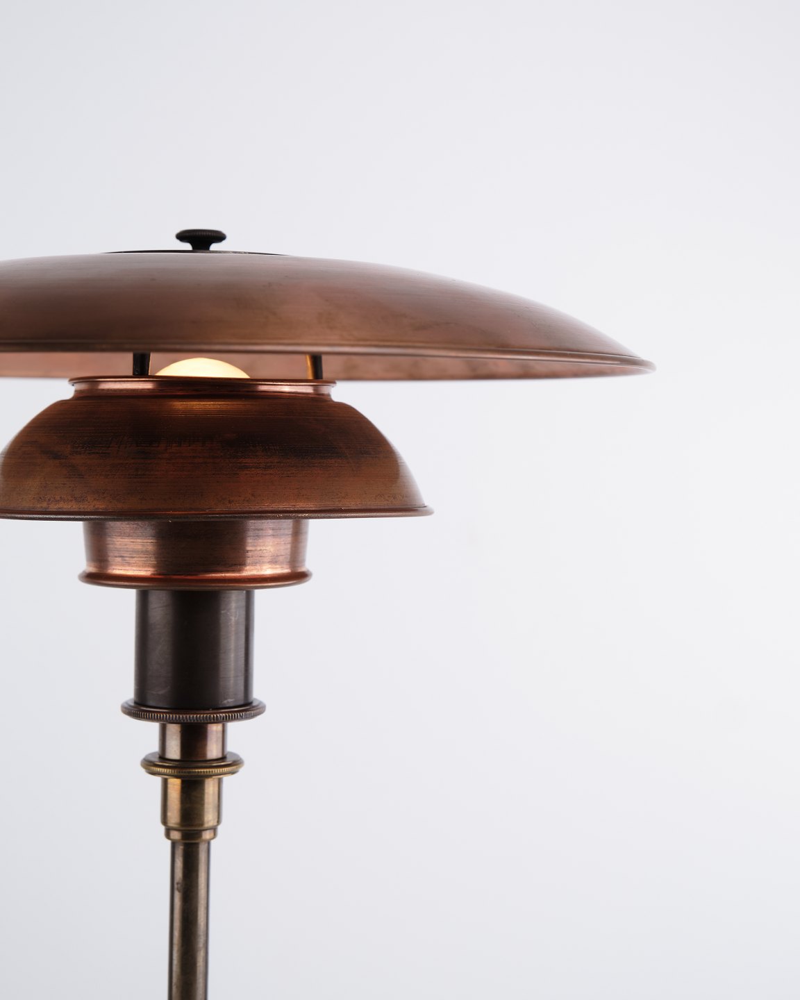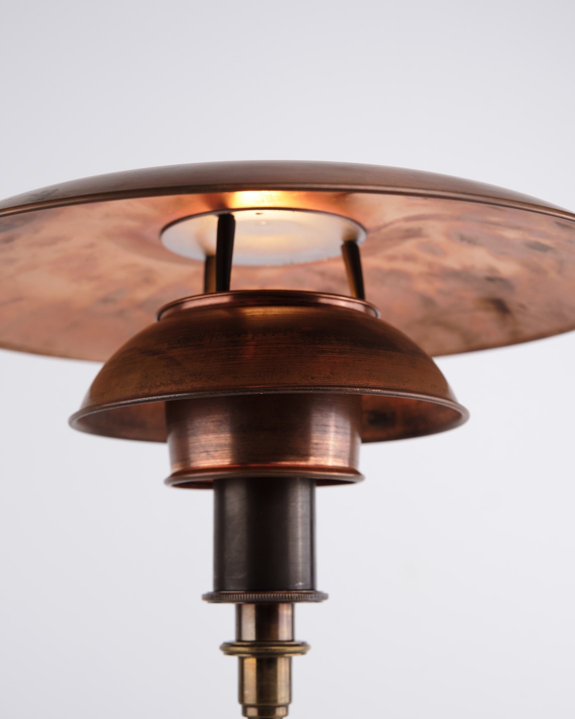 Poul Henningsen Tischlampe Modell PH 3/2 mit Kupferschirmen und Fuß aus brüniertem Messing, Louis Poulsen