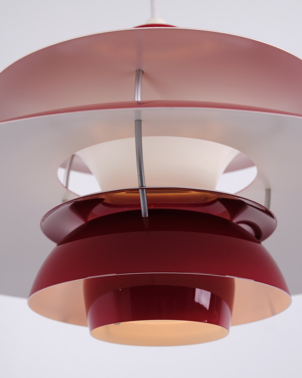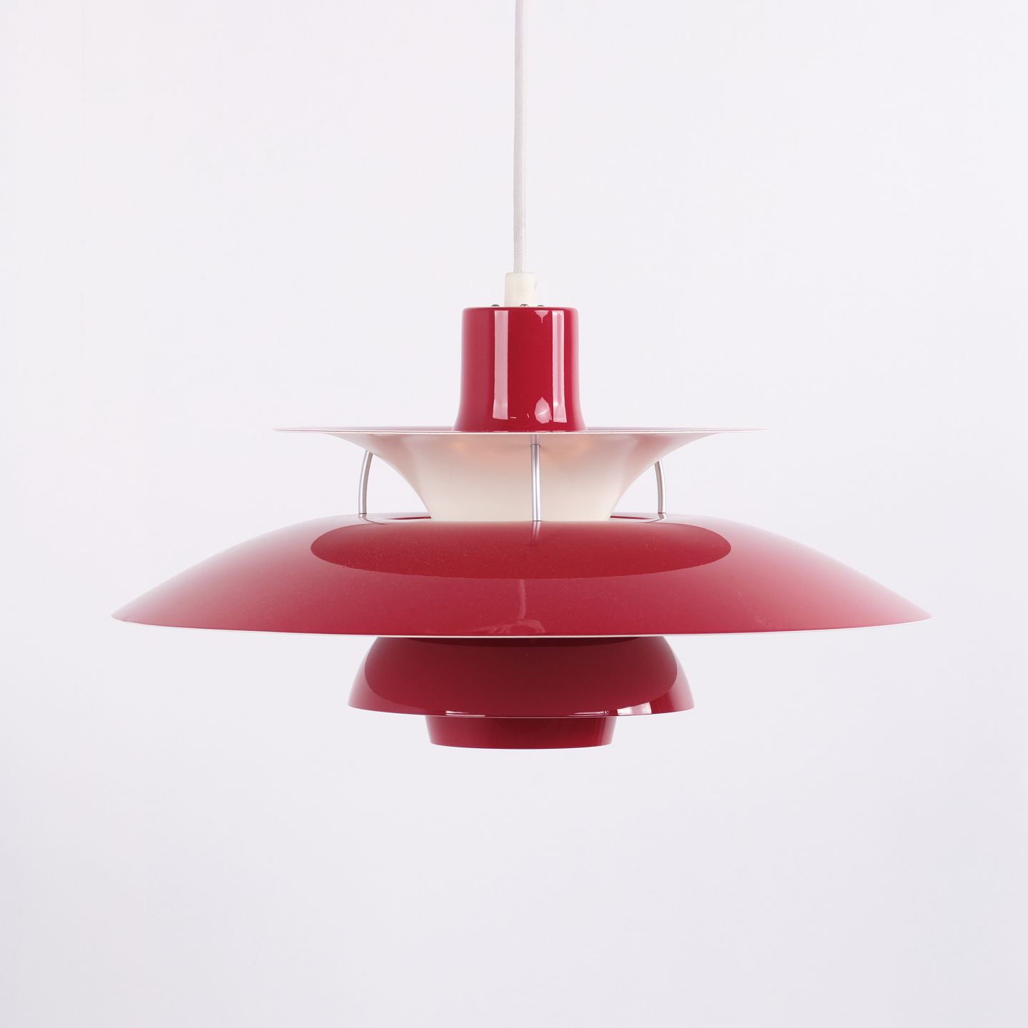 PH 5 Pendelleuchte aus rot lackiertem Metall von Louis Poulsen, entworfen von Poul Henningsen. Klassische dänische Leuchte mit blendfreiem und funktionalem Licht.