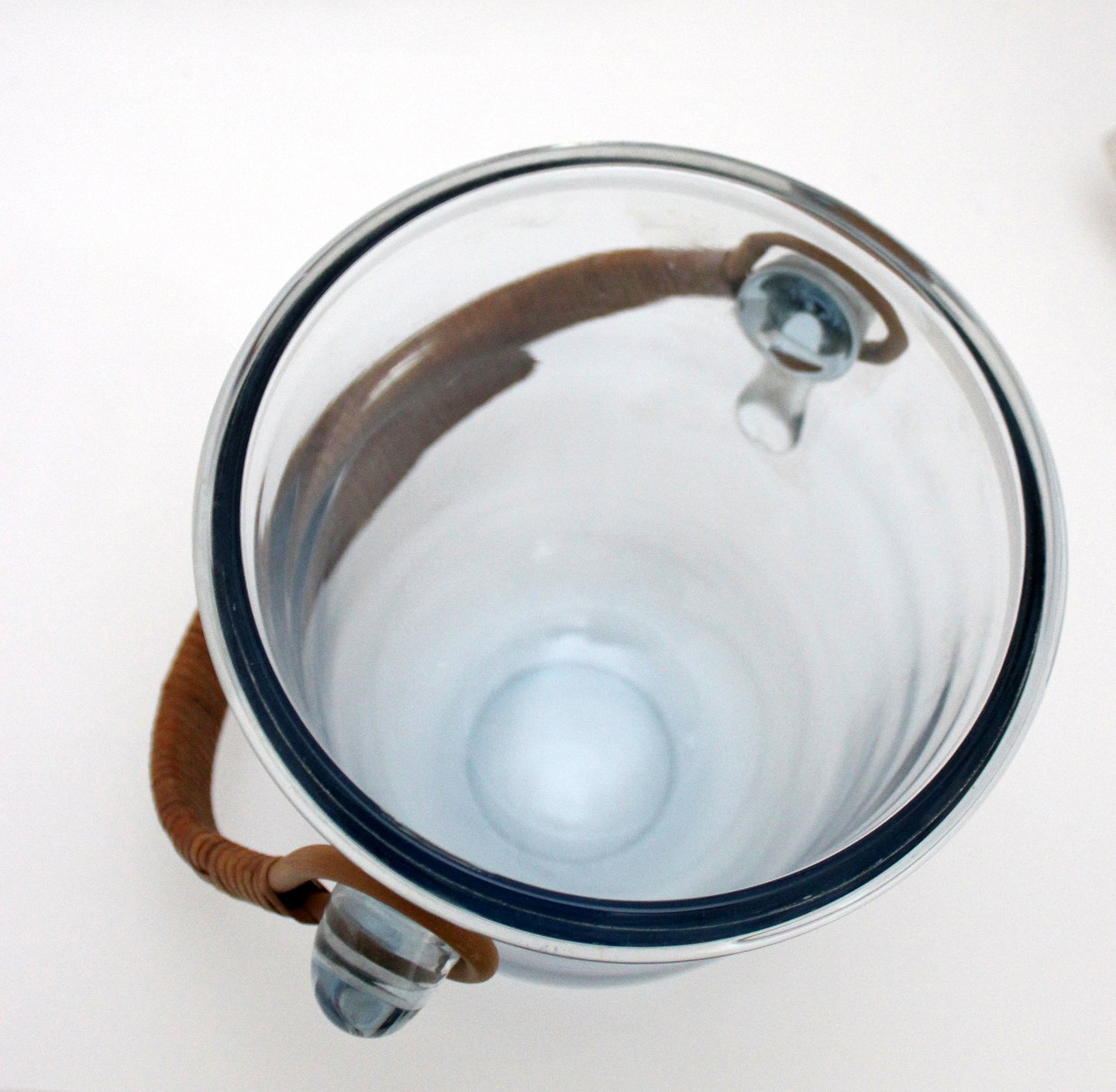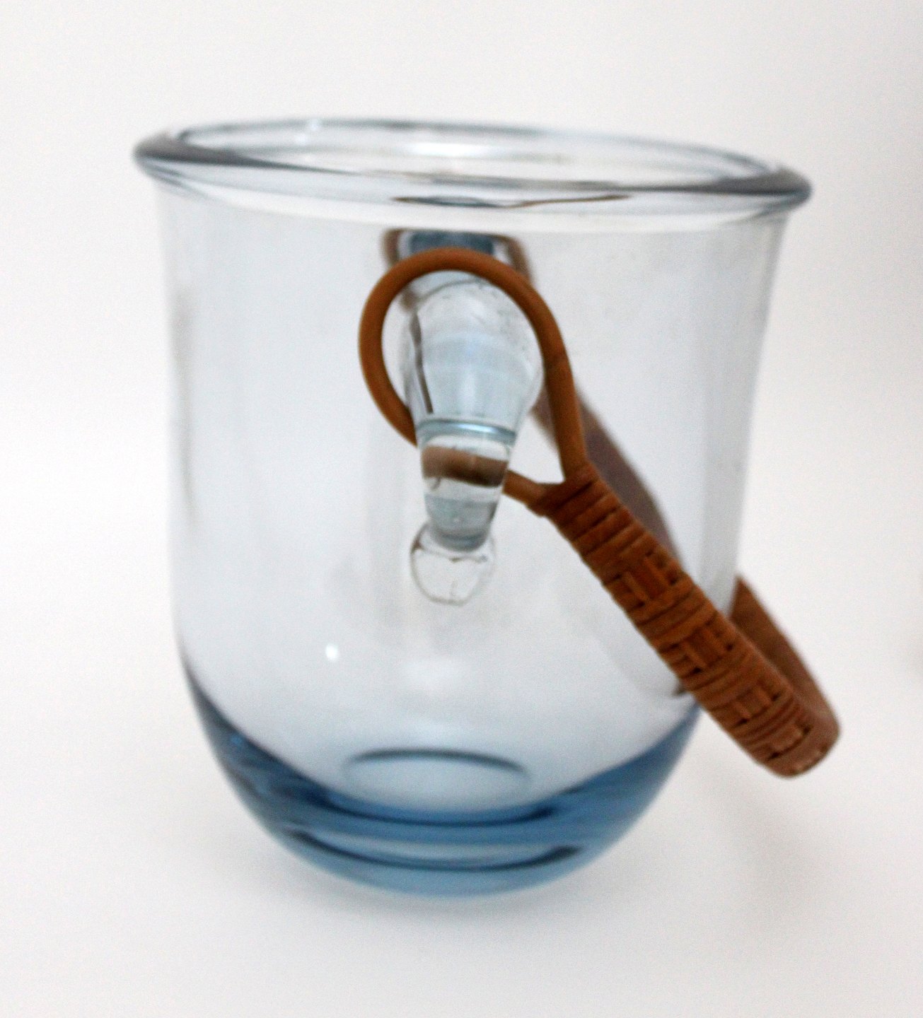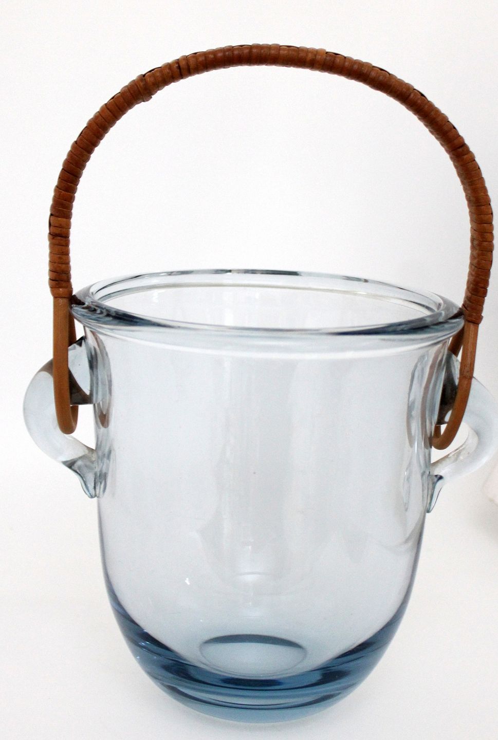 Text zugänglich auf Dänische: Holmegaard, Champagnekøler, stor isspand i transparent aquablå kraftigt glas med basthank. Designet af Jacob E. Bang i 1934. Ingen signatur. Højde 19,5 cm. Øverste diameter 18 cm. Vægt 2 kg. God stand men fremstår med ridser midt på. Pris: 675 kr. stk. Lager: 1