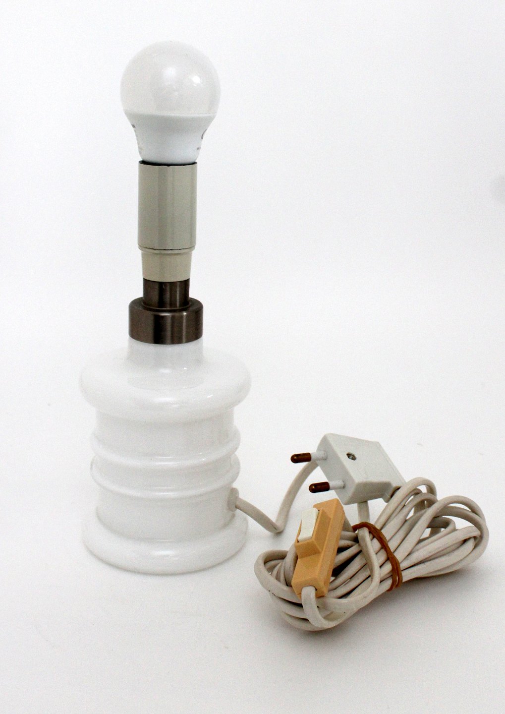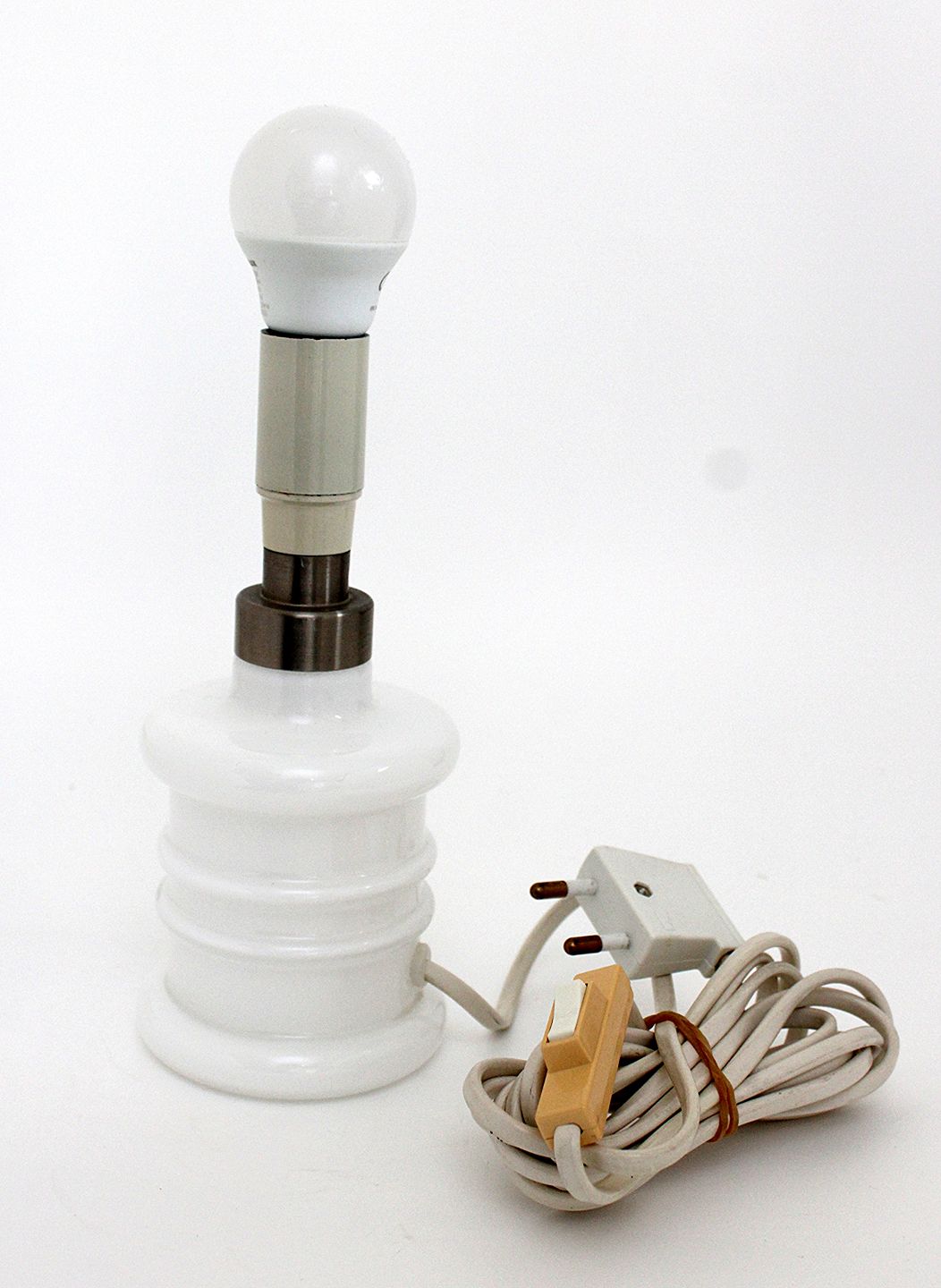 Text zugänglich auf Dänische: Holmegaard, Apoteker serien, hvid opaline reollampe. Designet af Sidse Werner 1985. Højde 19 cm. incl fatning 19 cm. Diameter 8 cm. Hvid ledning med beige afbryder. Sjælden størrelse. Pris: 475 kr.