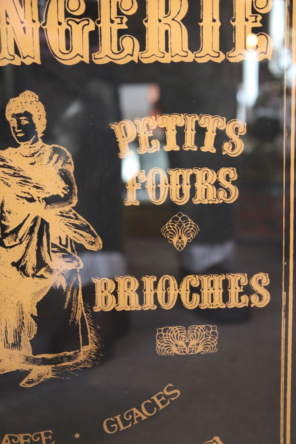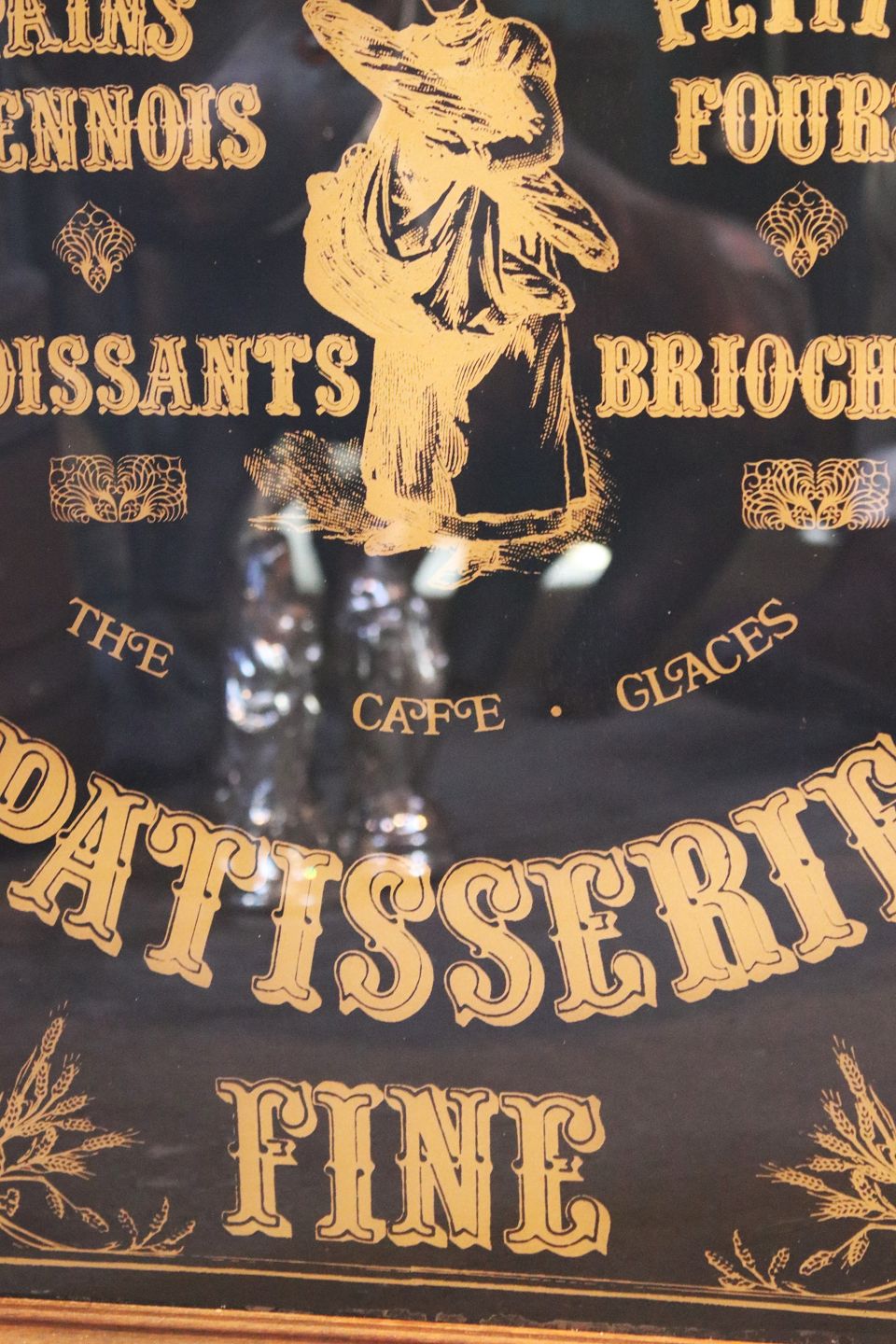 Reklame skilt fra en gammel fransk konditor / bageri , malet på glas (Bagsiden) "Boulagerie / Patisserie Fine" i sort og guld.