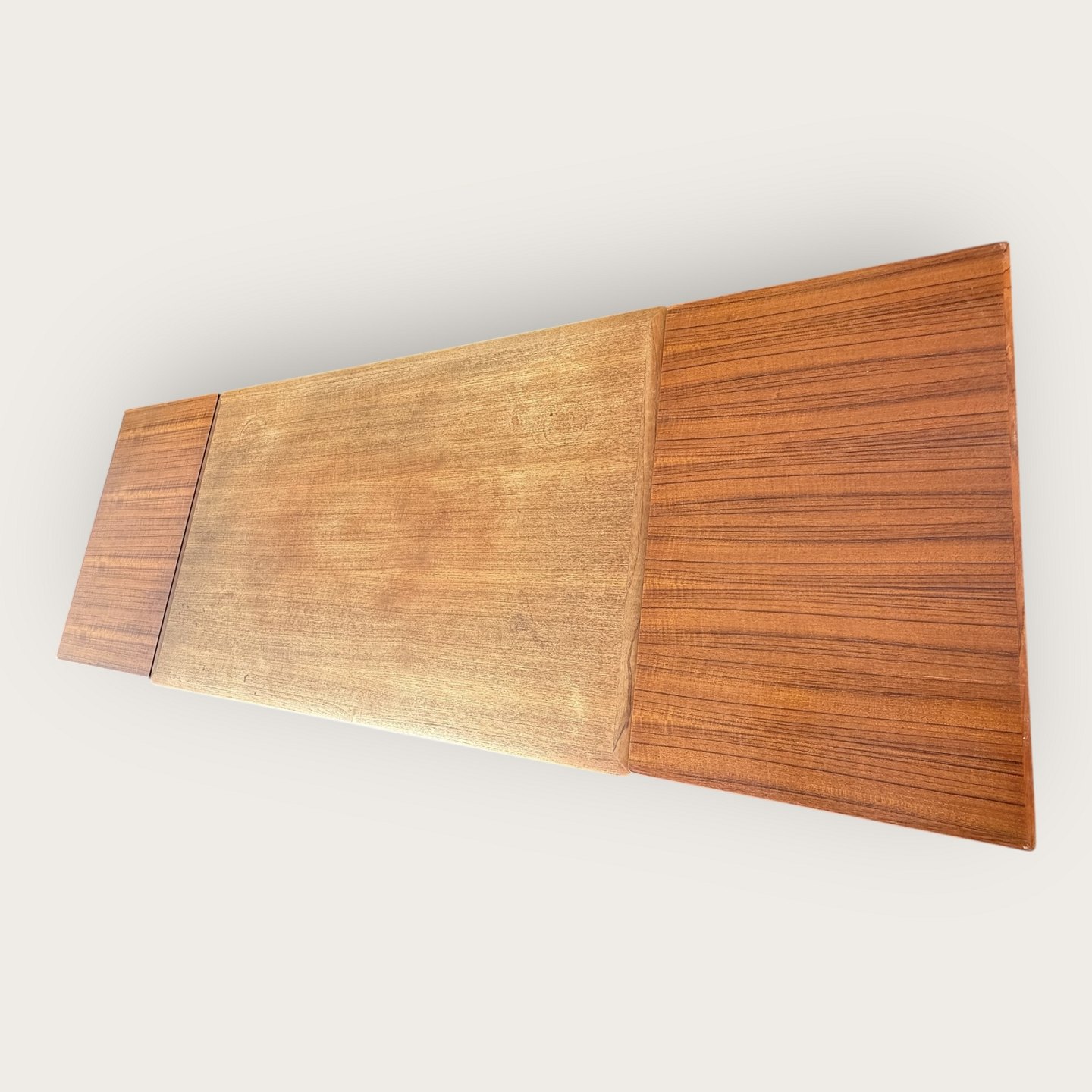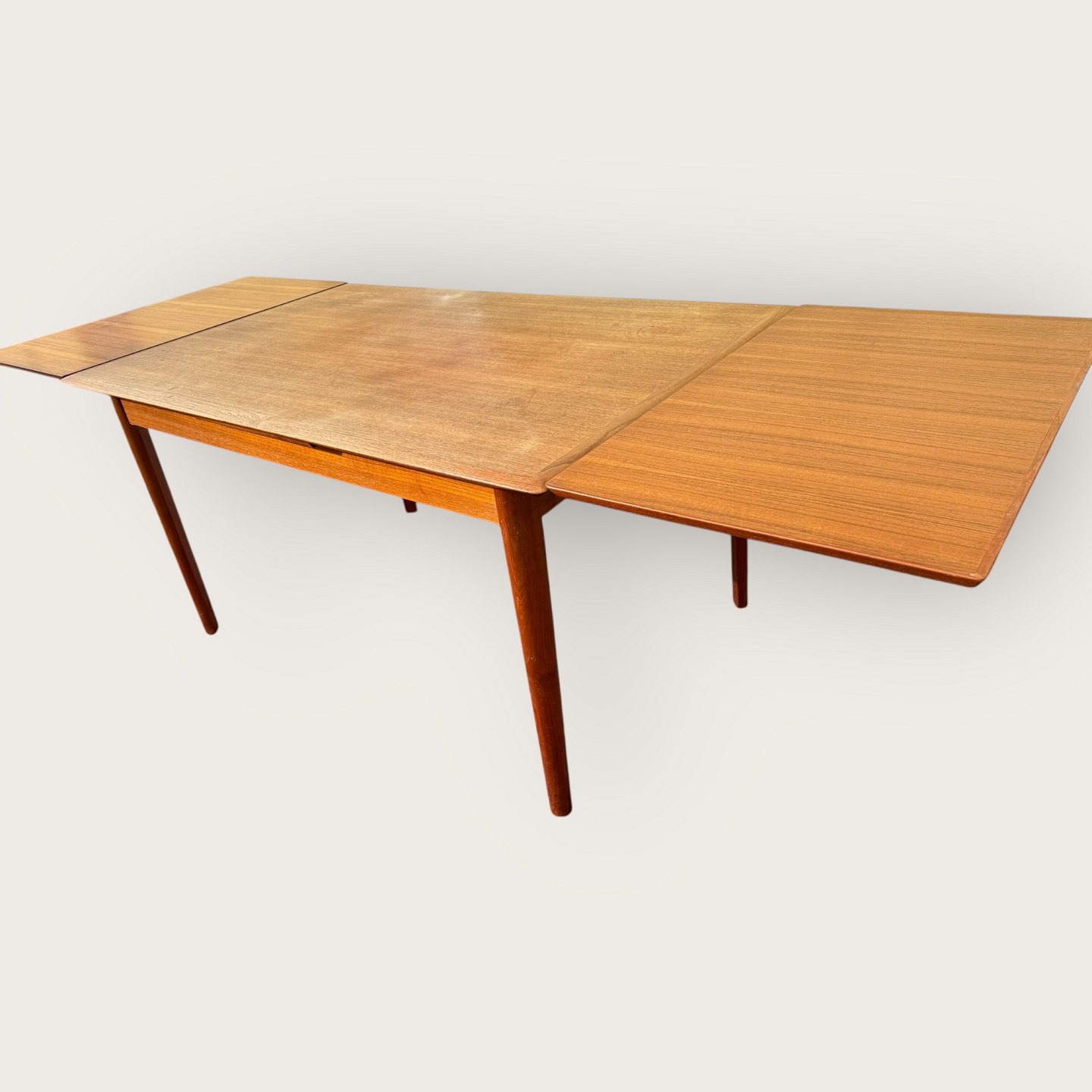 Esstisch aus Teakfurnier mit Beinen aus massivem Teakholz, dänisches Design der 1960er Jahre, gemarkt mit Ellegaards møbelfabrik und EG møbel Silkeborg Nr. 80 (siehe zwei Fotos), Maße: H x B x T 73 x 89 x 139 (240) cm * Guter gebrauchter Zustand *
