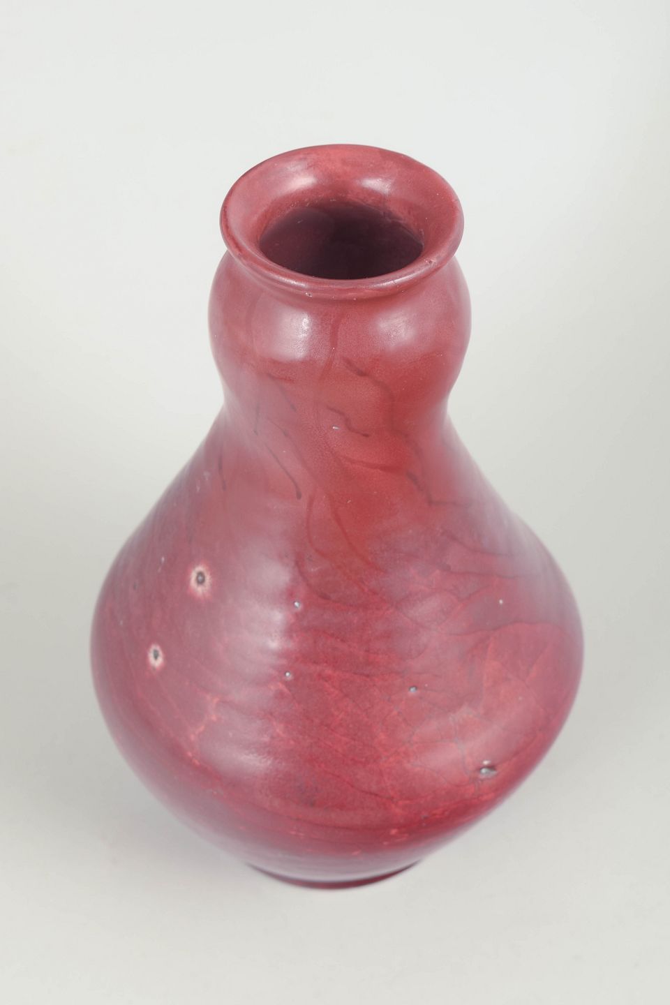 Elegant balusterformet vase i glaseret lertøj med dyb rød okseblods glasur og blød, let flydende overflade. Glasuren fremstår med fine variationer og diskrete spor fra brændingen. Signeret HAK i bunden.